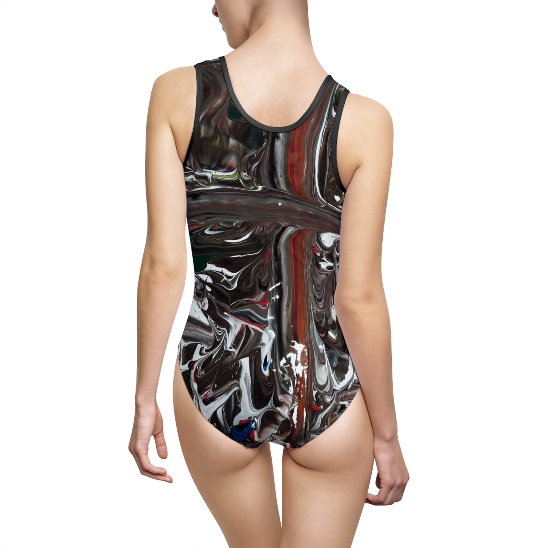 This one-piece swimsuit wraps you in a sleek, sculptural print that moves like oil and glass across the body. Lightweight and stretchy, it sits close to the skin and supports the chest with an internal elastic strap so you can swim or lounge without constant readjusting. The deep, glossy swirls of black, charcoal and hints of red read modern and slightly edgy—a statement for those who prefer clean lines with an artistic twist. Wear it to a weekday pool session when you want to feel composed and confident, or pack it for a seaside weekend where quiet design speaks louder than logos. The U-shaped neckline and back provide balanced coverage while the elastic-trimmed edges keep the silhouette smooth under a cover-up or towel.