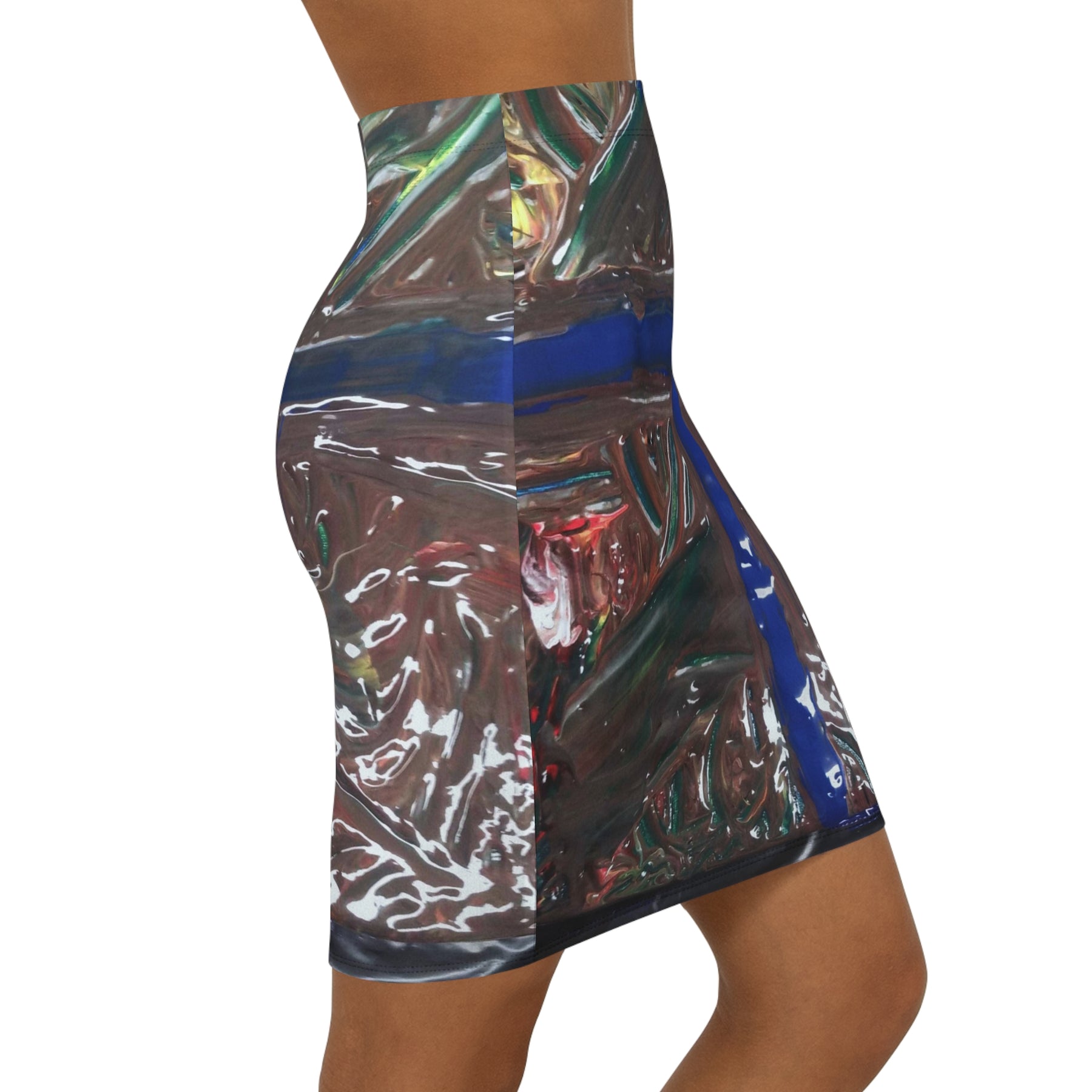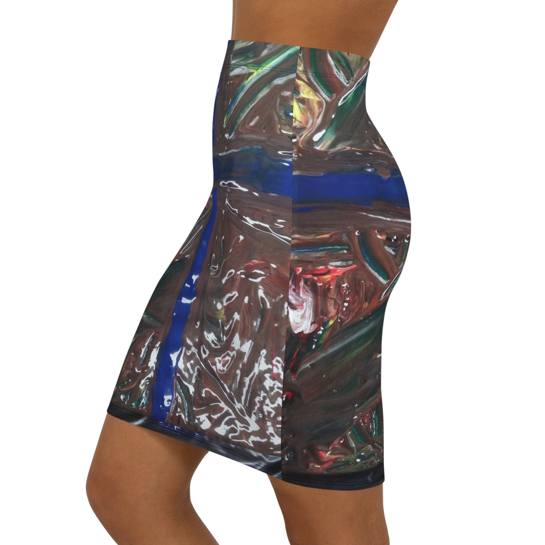 This mid-waist pencil skirt brings bold, painterly energy into everyday wear. The close, slimming silhouette hugs curves while the four-way stretch fabric moves with you, so the skirt feels as alive as the brushstrokes printed across it. Deep, glossy swaths of blue cut through earthy, textured tones — a look that reads like contemporary abstract art when you walk into a room. The elastic waistband and soft polyester-spandex blend keep comfort steady from morning to evening, while the all-over print keeps the design uninterrupted and striking. Wear it to gallery openings, urban nights out, or whenever you want your outfit to feel expressive and intentional.