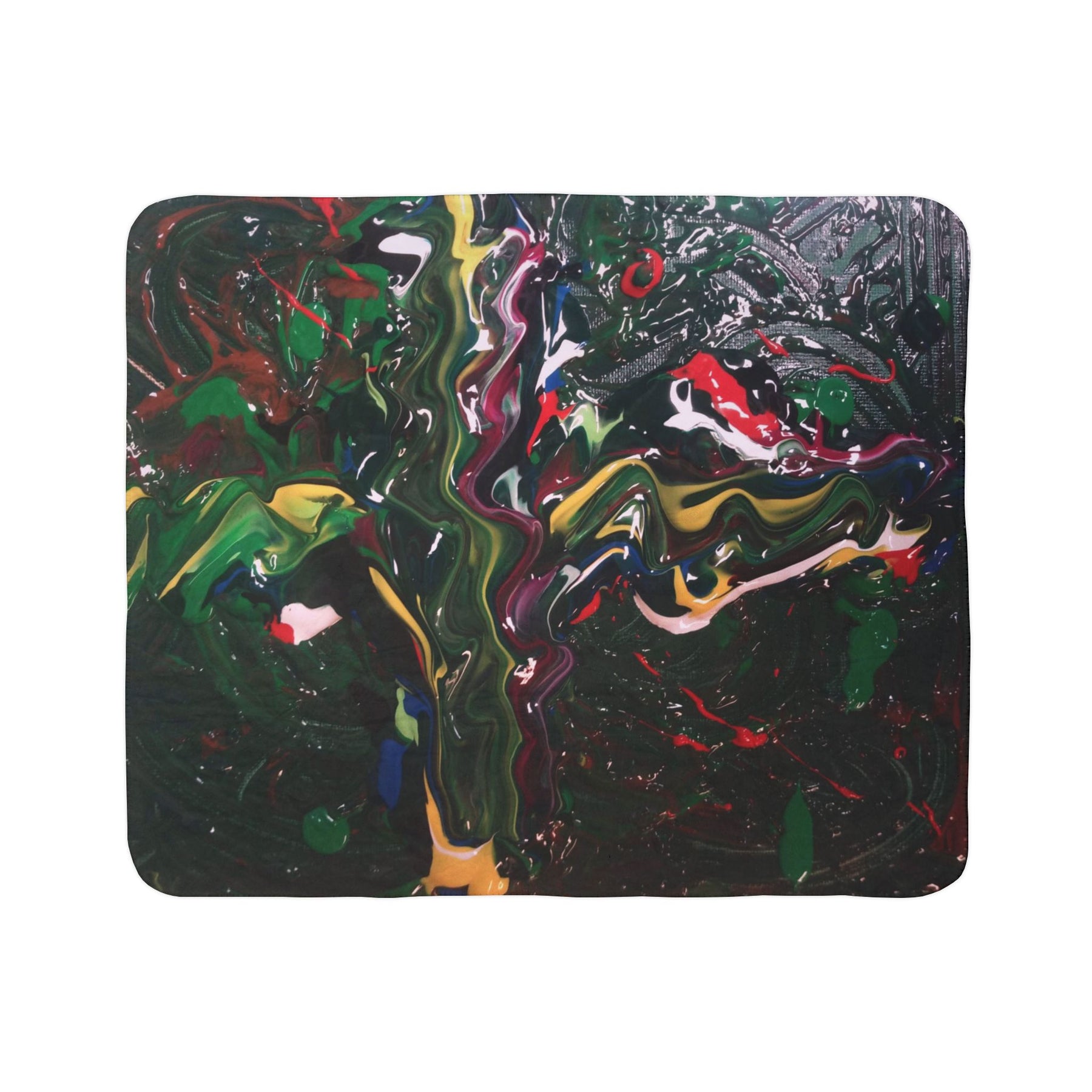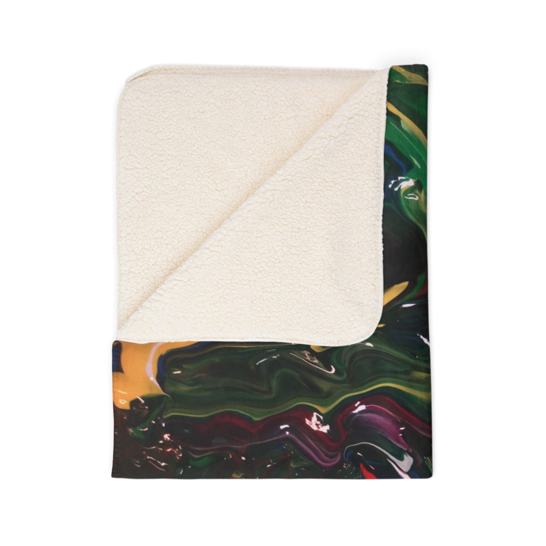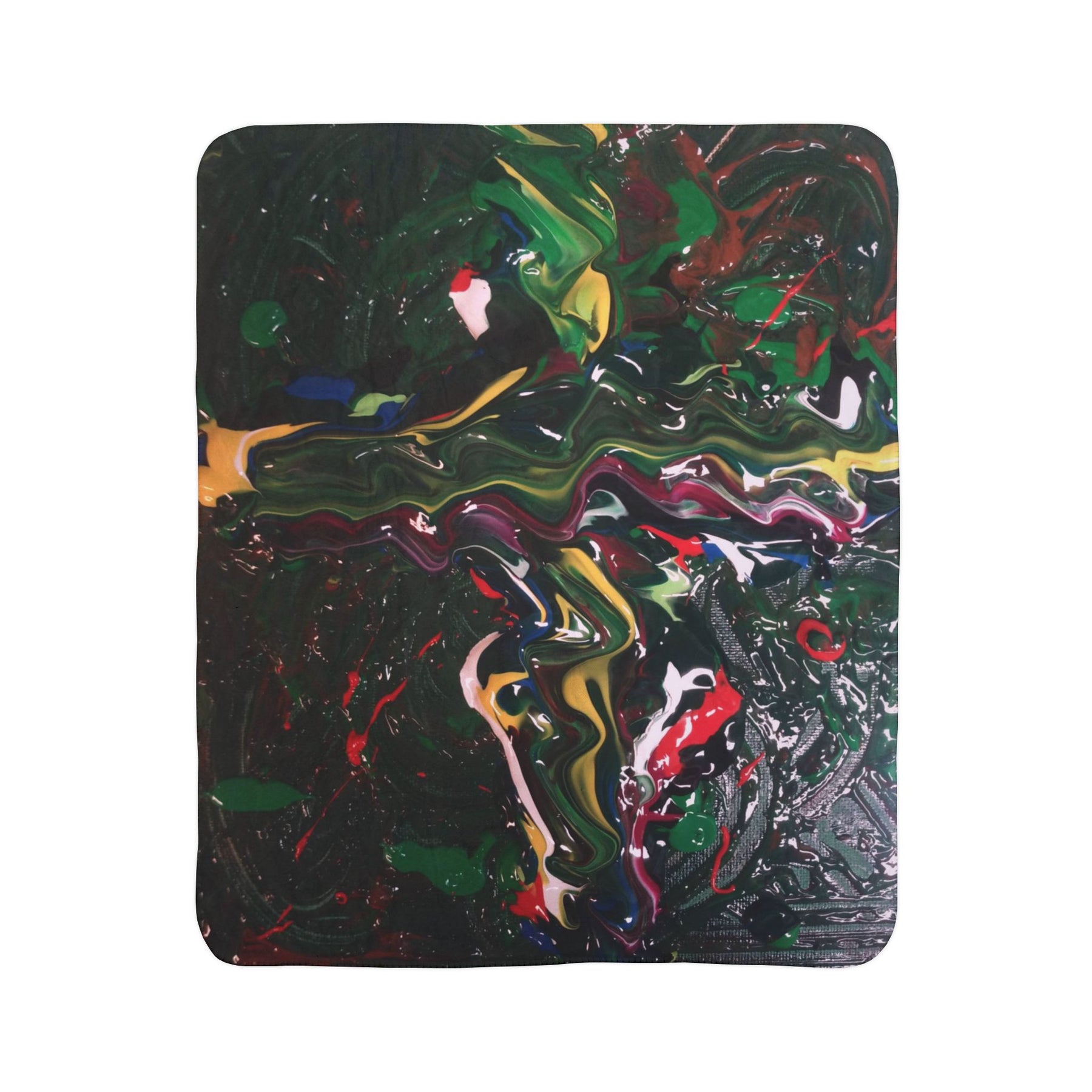 This cozy fleece sherpa blanket wraps a bold, painterly energy into soft, everyday comfort. Deep, brooding blacks form a tactile backdrop for swirls of emerald greens, rich crimsons, sunlit yellows and hints of cobalt—like an abstract canvas folded over your lap. The plush, double-sided polyester pile holds the vibrant colors with clarity while staying thick and warm. Drape it across a sofa for an instant studio-inspired accent, pull it over tired shoulders after a long day, or layer it on a bed to introduce lively texture and movement to a calm room. It feels weighty and comforting without being bulky, and the hemmed edges and matched seam thread give it a finished, handmade touch that ages well with use.