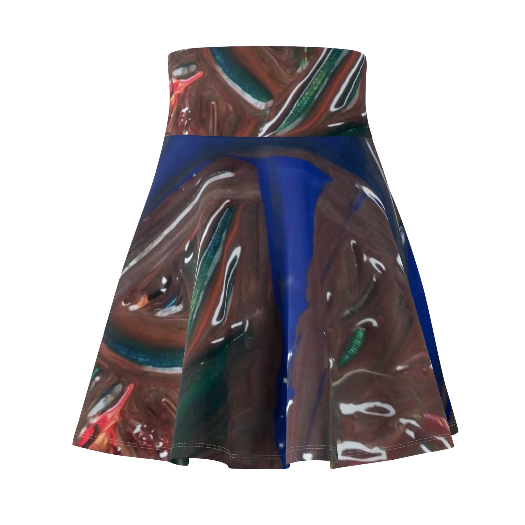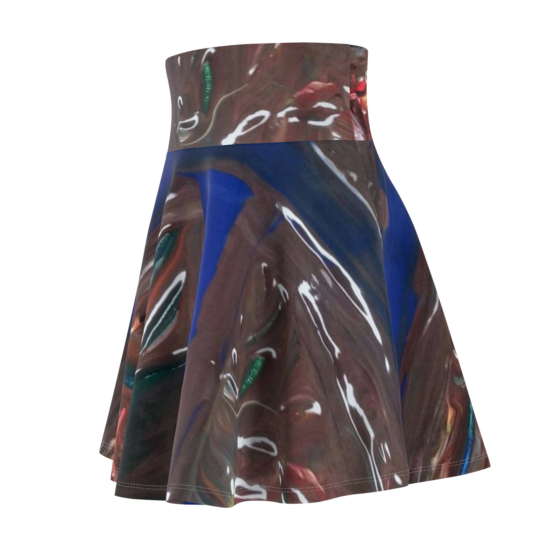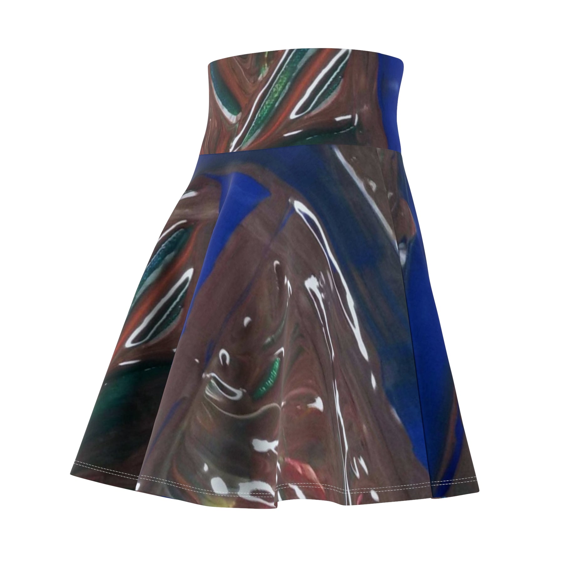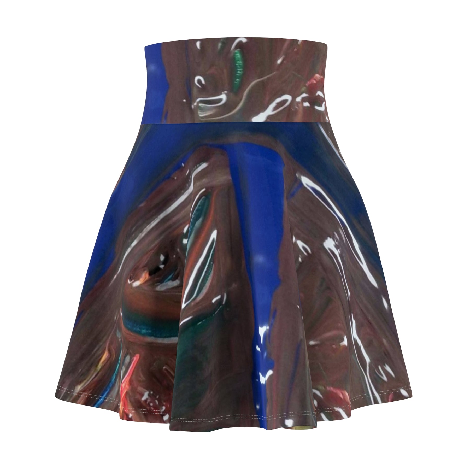 A playful, artful skater skirt that moves like liquid color. The high-rise double waistband sits snug and smooth, while the full flared cut catches light and motion so the abstract, glossy print reads differently with every step. Lightweight stretch fabric drapes close to the body yet gives space to twirl — wear it layered over tights in cooler months or bare-legged when days are bright. This skirt brings a wearable piece of contemporary visual texture to your everyday rotation, turning short outings, gallery visits, and late-afternoon walks into small moments of expression.