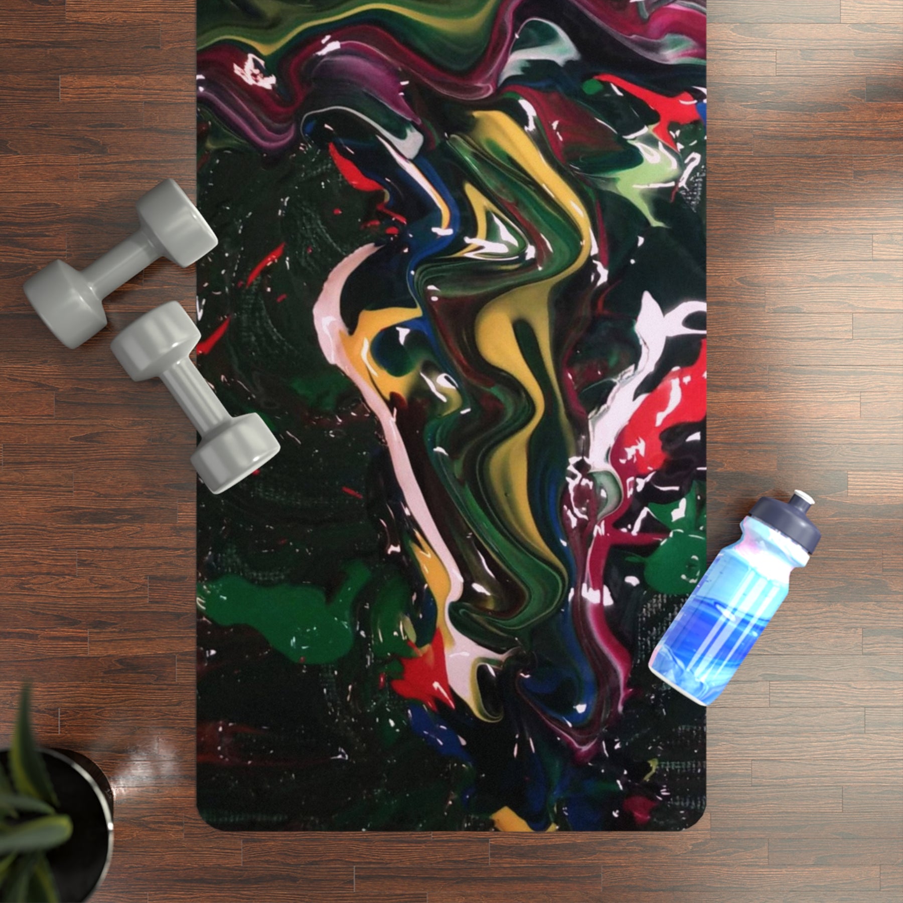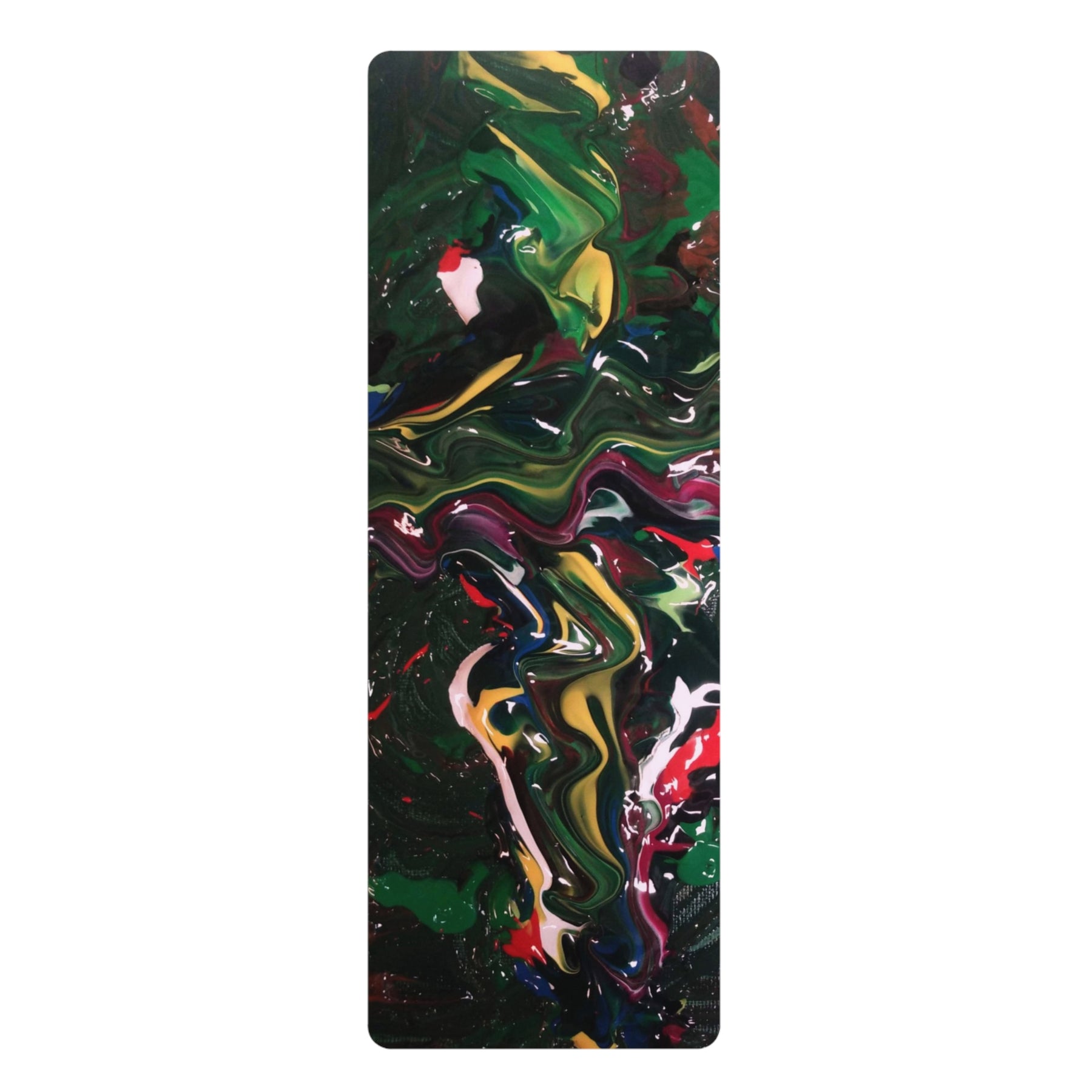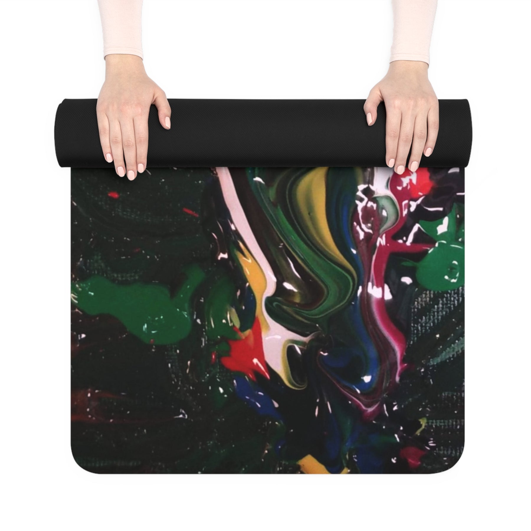 This yoga mat brings movement and color together — a slim, lightweight surface with a soft microfiber suede top printed edge-to-edge in a bold, painterly swirl of greens, reds and golds. The natural rubber base grips the floor so your practice stays steady, while the 3mm thickness keeps the roll compact for travel or tight studio spaces. A simple black polyester carrying strap tucks on when you roll it up, making it easy to grab and go to morning classes, rooftop flows, or meditation breaks at work. Keep it out of direct sun to preserve the vibrancy of the artwork and enjoy a mat that feels soft beneath your hands and feet yet holds firm through poses.