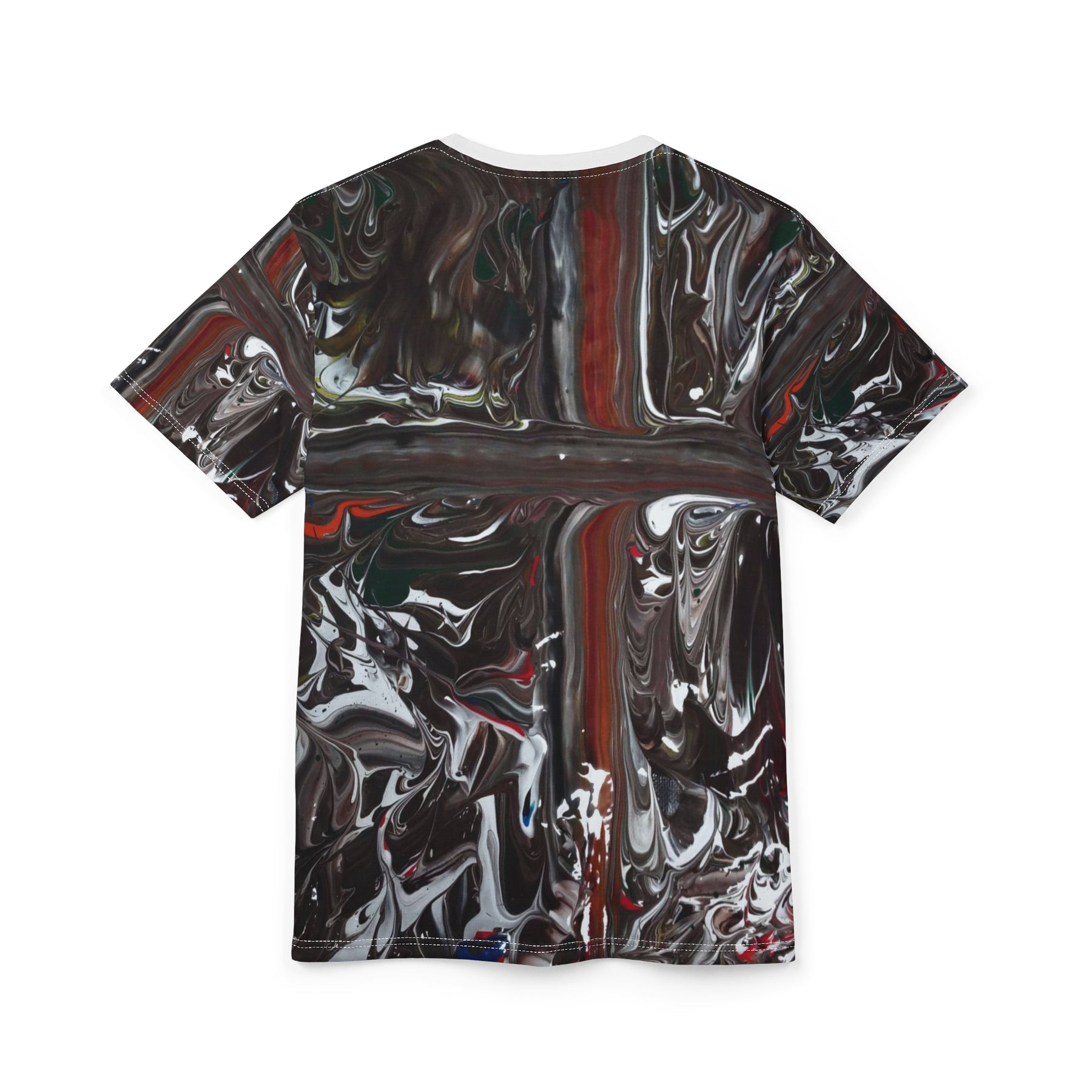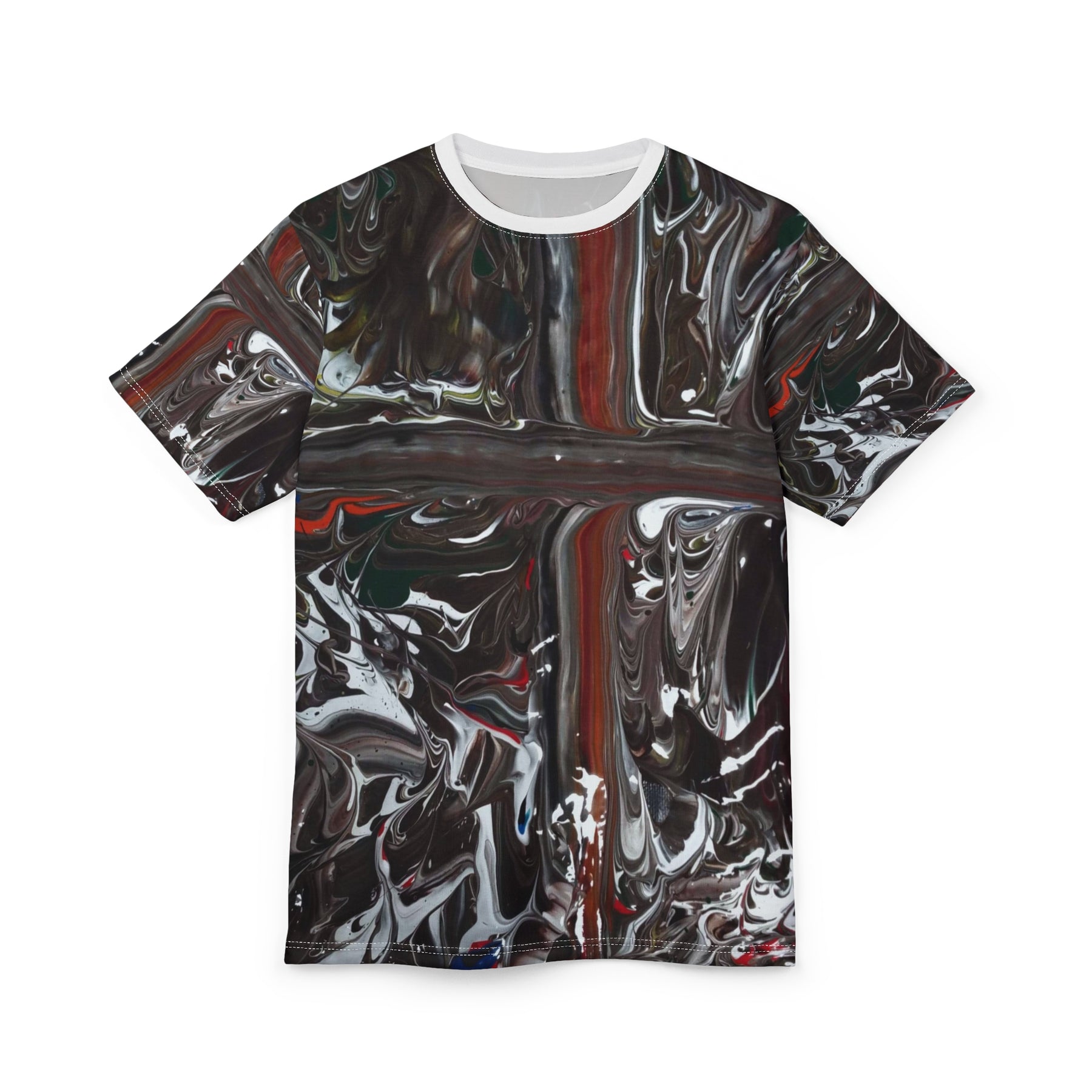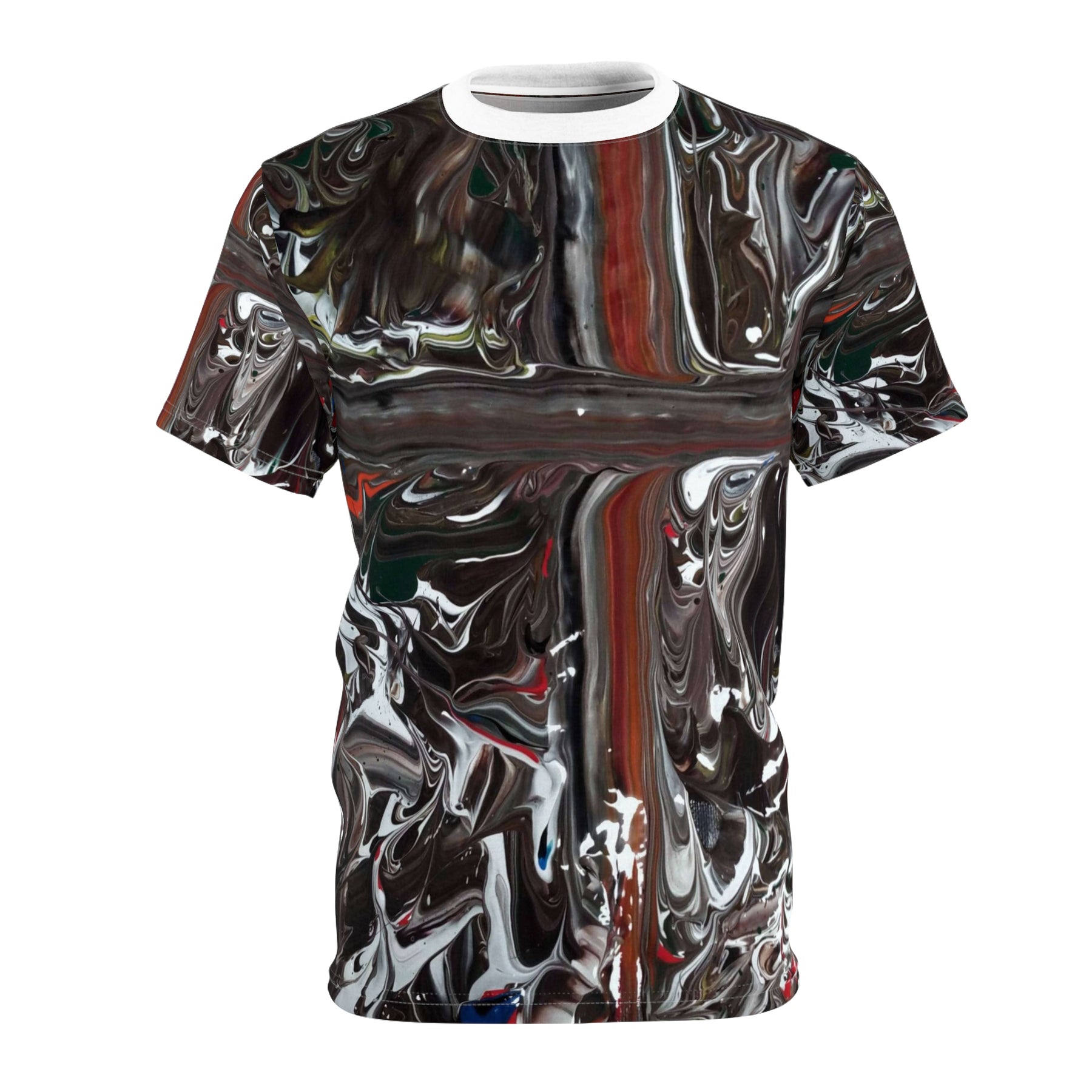 This all-over print tee brings moody, liquid movement to your everyday wardrobe. Dark swirls of black, deep brown and streaks of rust flow across the fabric like wet oil on glass, giving the shirt an artful, urban-grunge energy. Lightweight yet durable polyester keeps the print vibrant and the shape consistent, while the regular fit and tagless design make it comfortable for long wear. Wear it under a leather jacket for nights out or layered for cooler days — it reads like wearable artwork that ages with the person who wears it.
