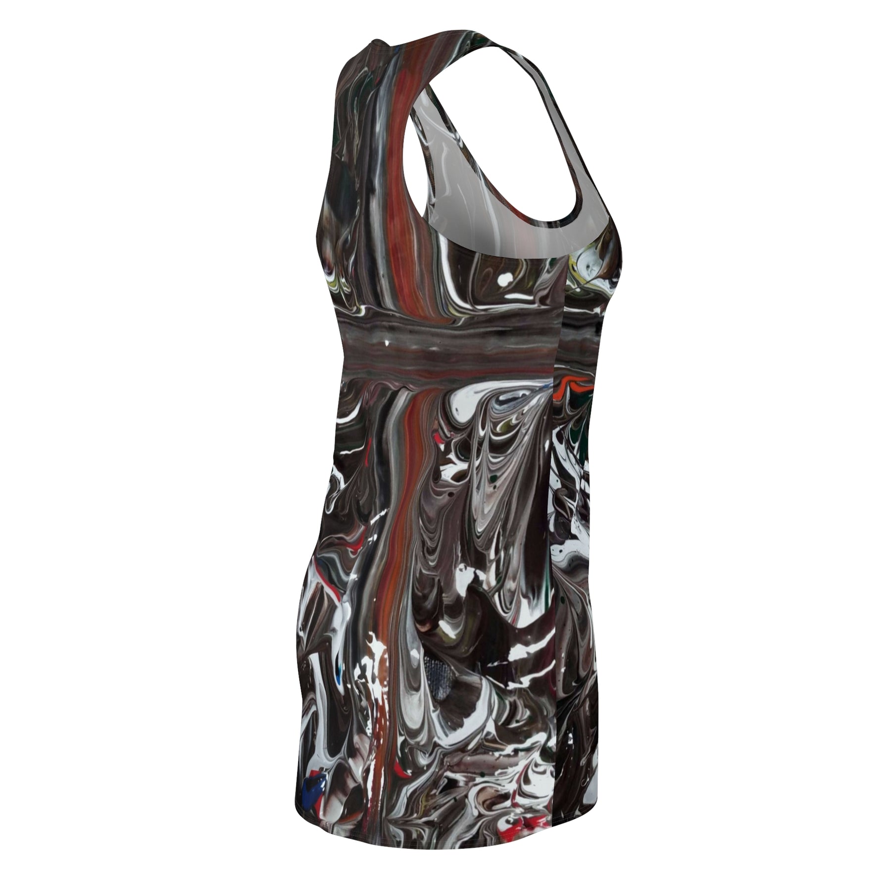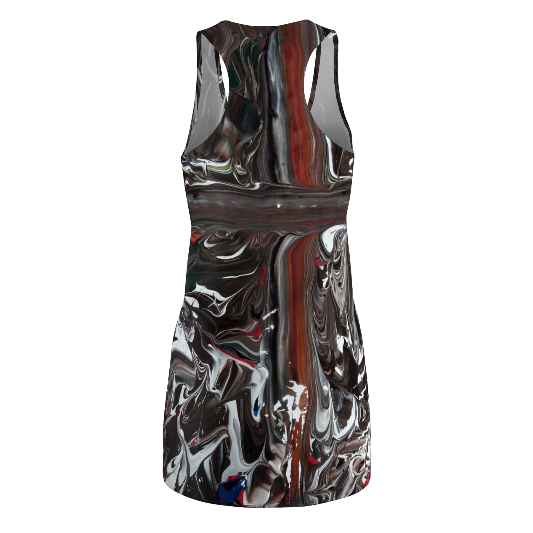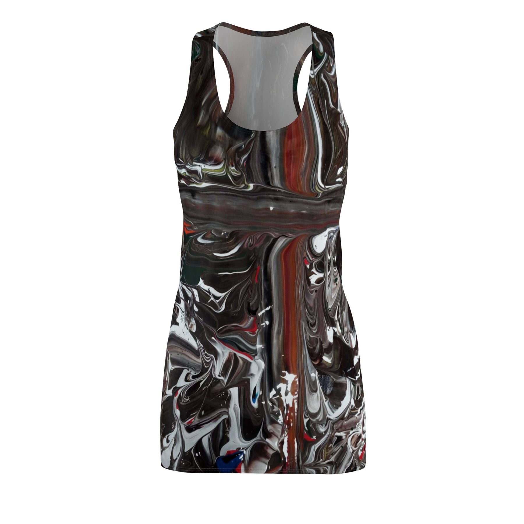 A lightweight racerback dress with an all-over abstract metallic print that feels like movement captured in fabric. The sporty cut sits close to the body without restricting motion, while the moisture-wicking polyester keeps you dry during warm days or active moments. Imagine slipping this on for an evening walk through city lights or layering it under a jacket for a gallery opening — it reads modern, fluid, and quietly bold. The racerback and side seams give a confident silhouette that follows your shape, and the tagless finish keeps things comfortable against the skin. This dress wears like a small, wearable statement: urban energy made wearable, ready for moments when you want function and art to meet.