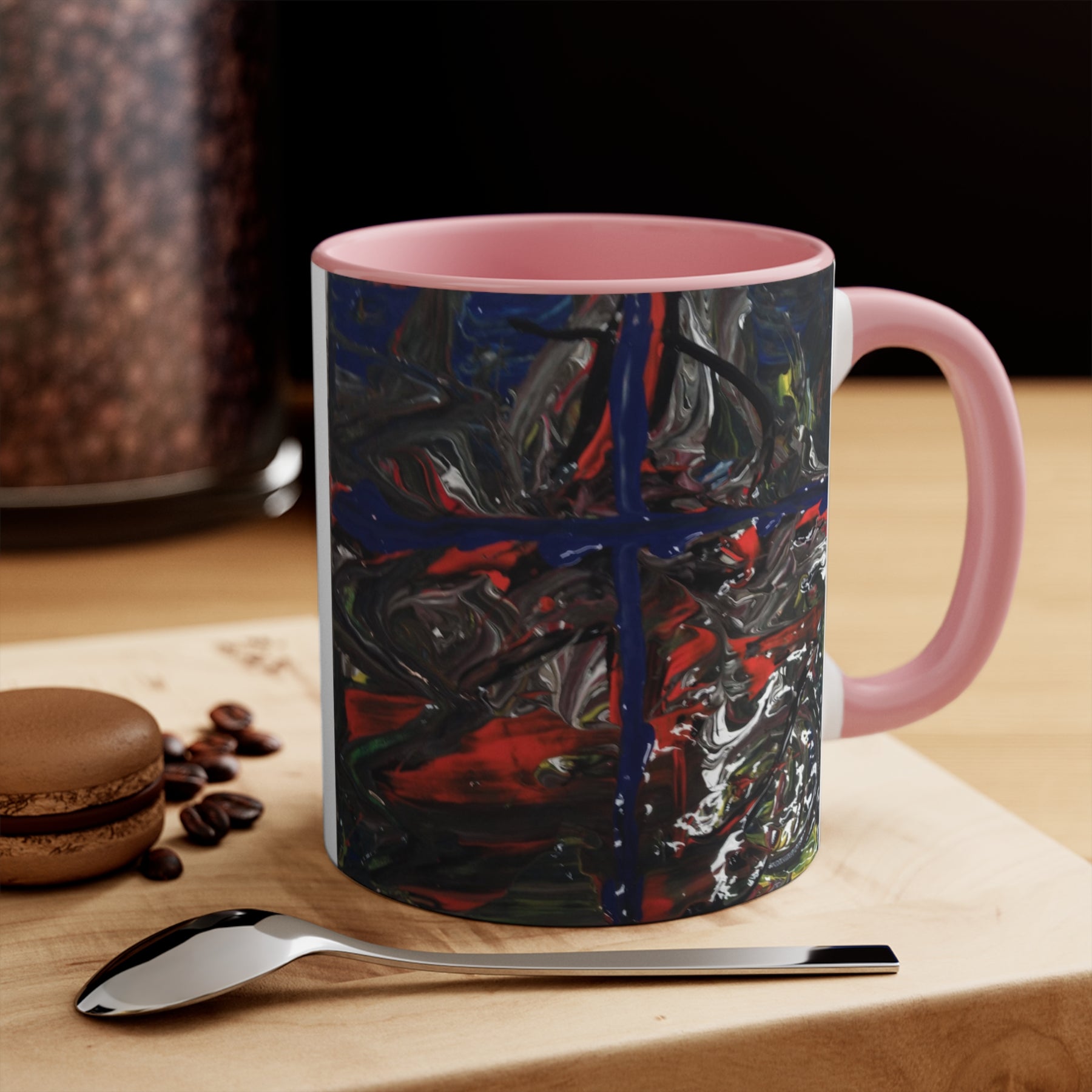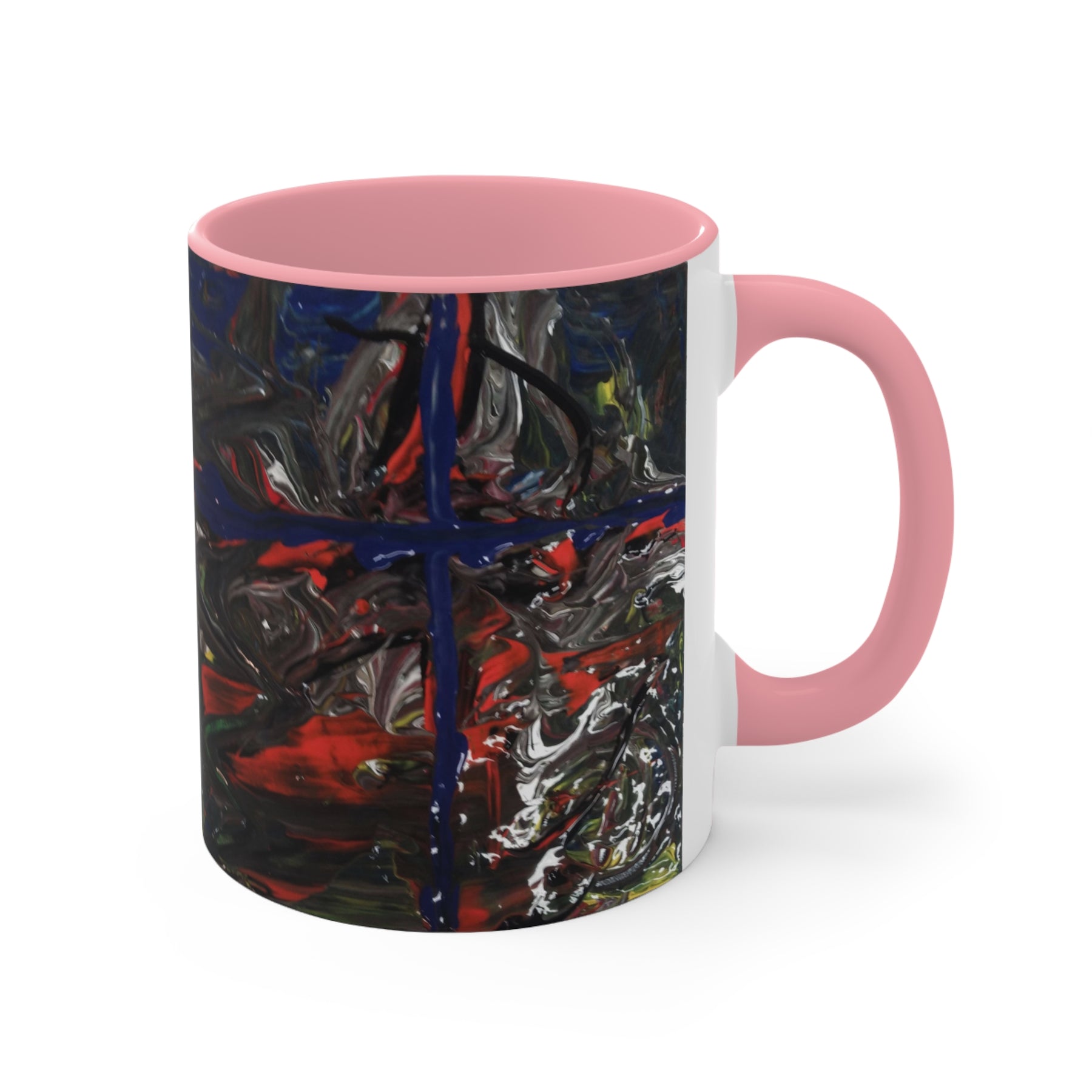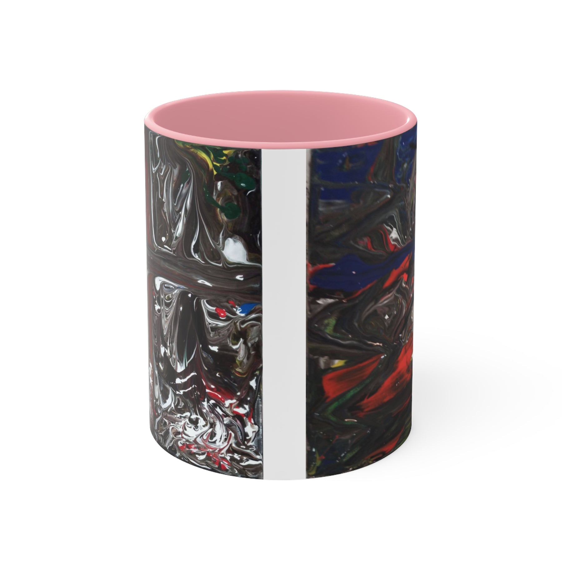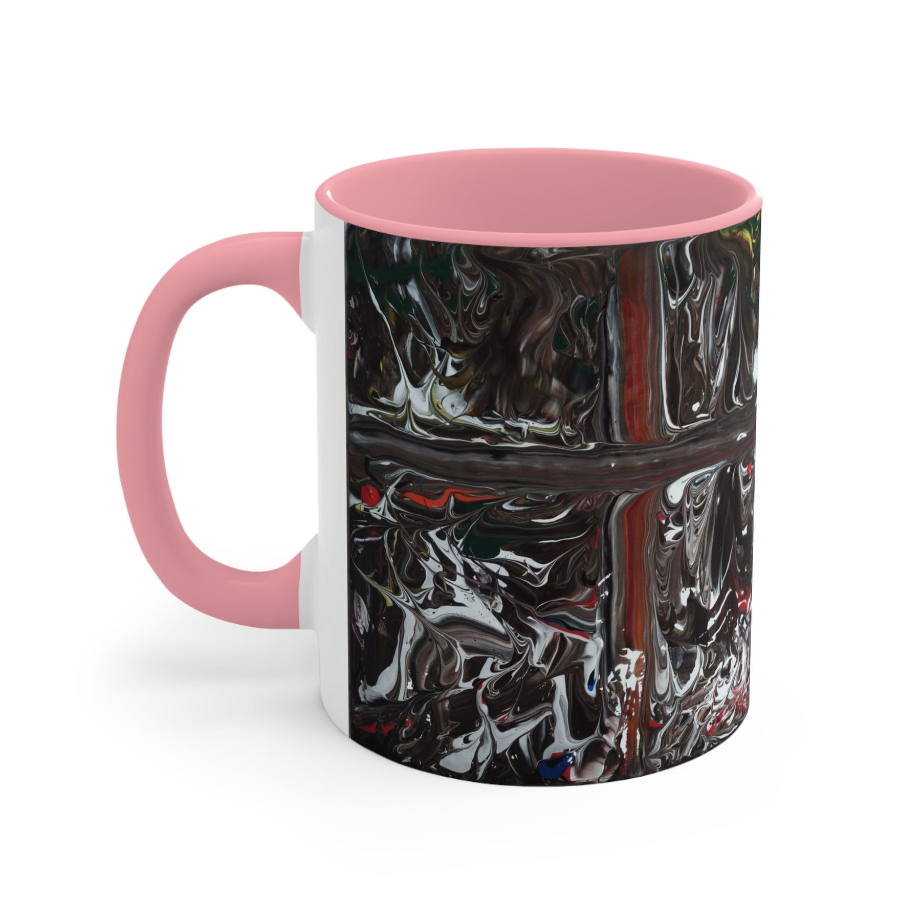 This ceramic accent mug brings artful texture and bold color into everyday moments. The glossy ORCA-coated print wraps around the exterior, showing a painterly, abstract design streaked with deep blacks, reds, and hints of color — like a studio canvas condensed into a comforting cup. The interior and handle come in a soft pink that frames the artwork and adds a warm contrast. It feels tactile in the hand, built for morning routines, late-night sketches, and quiet coffee breaks that deserve a little beauty.