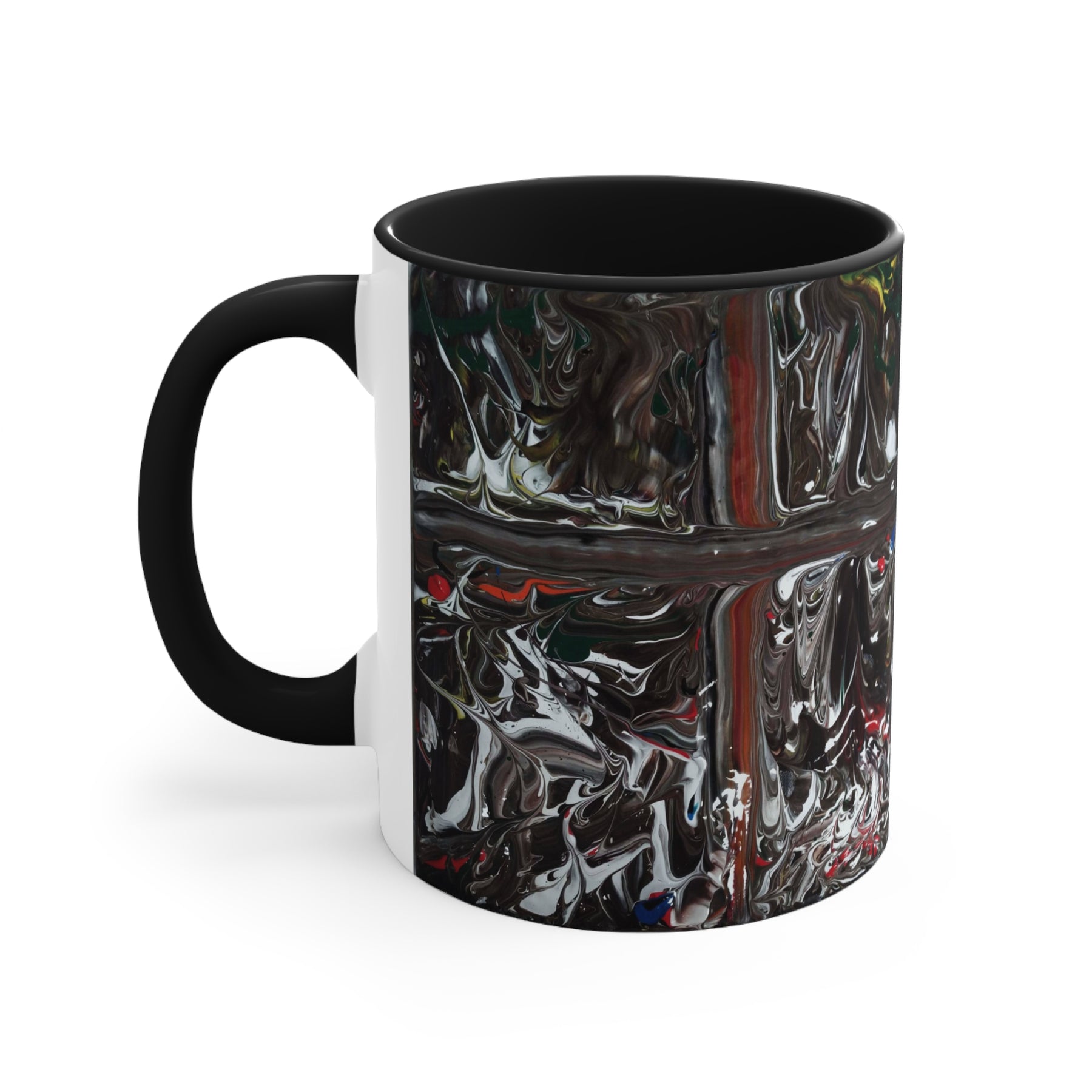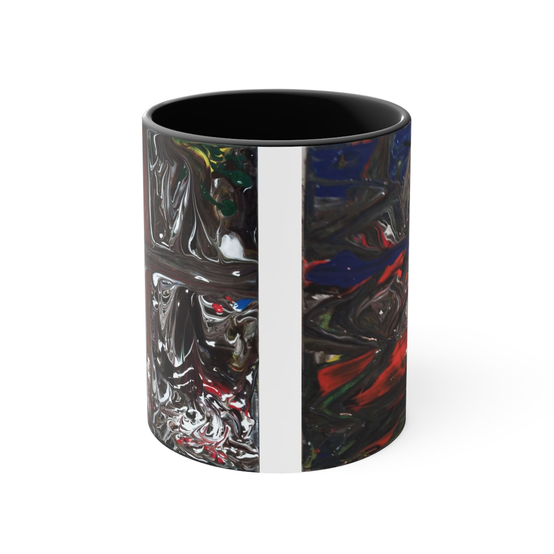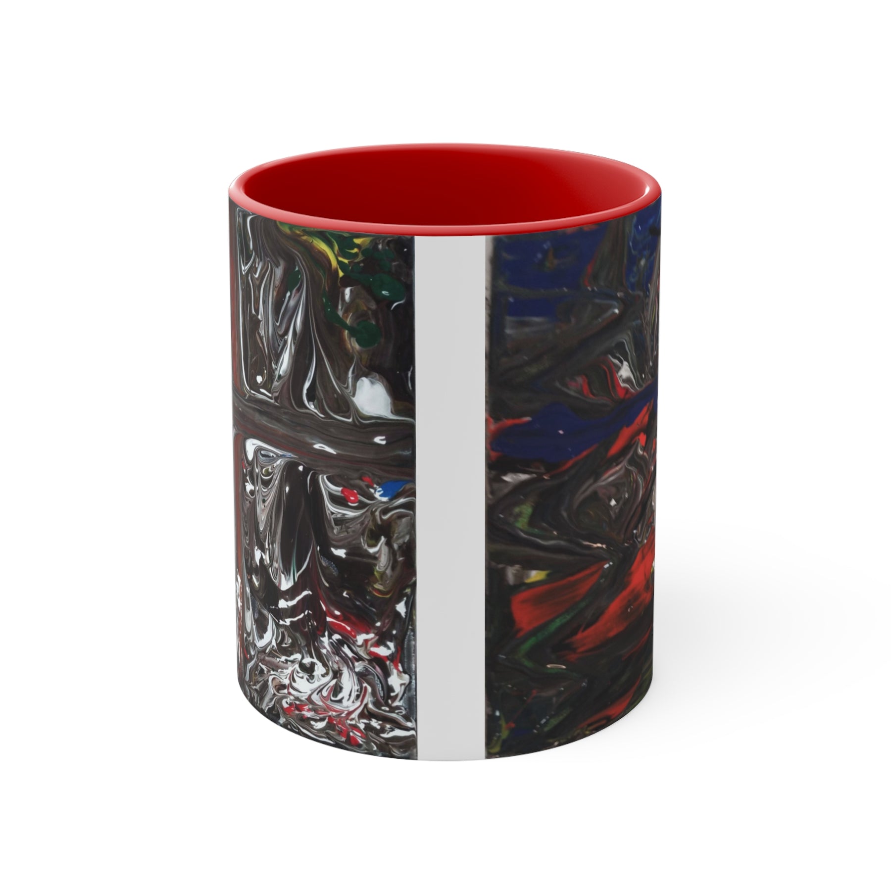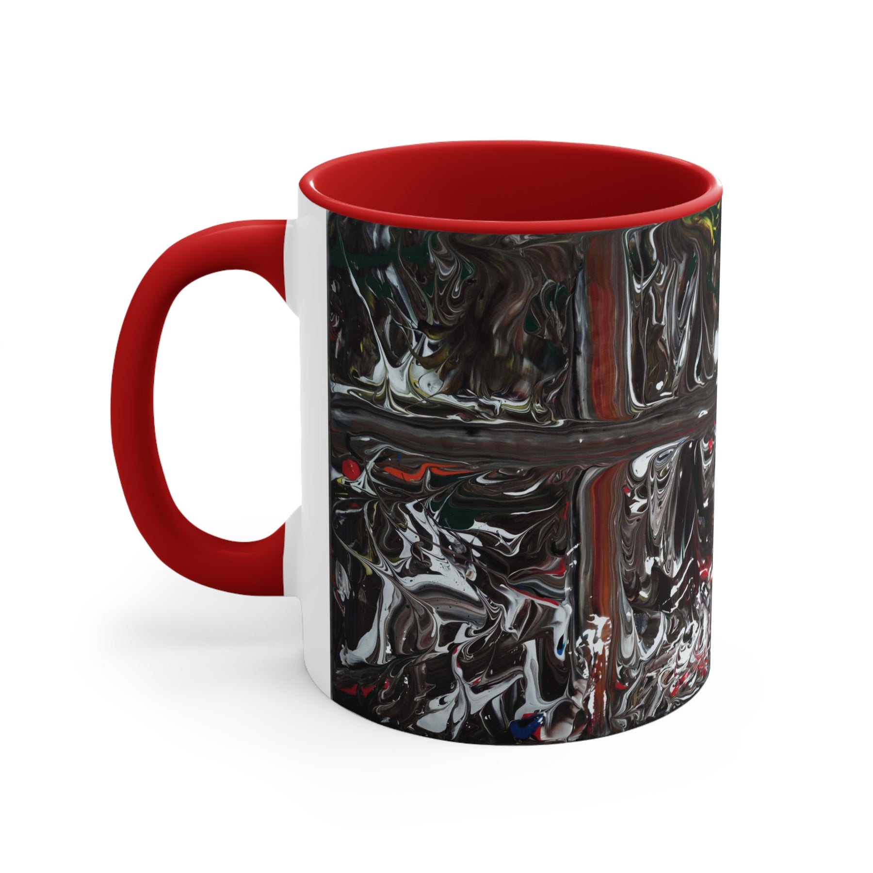 This ceramic accent mug brings artful texture and bold color into everyday moments. The glossy ORCA-coated print wraps around the exterior, showing a painterly, abstract design streaked with deep blacks, reds, and hints of color — like a studio canvas condensed into a comforting cup. The interior and handle come in a soft pink that frames the artwork and adds a warm contrast. It feels tactile in the hand, built for morning routines, late-night sketches, and quiet coffee breaks that deserve a little beauty.