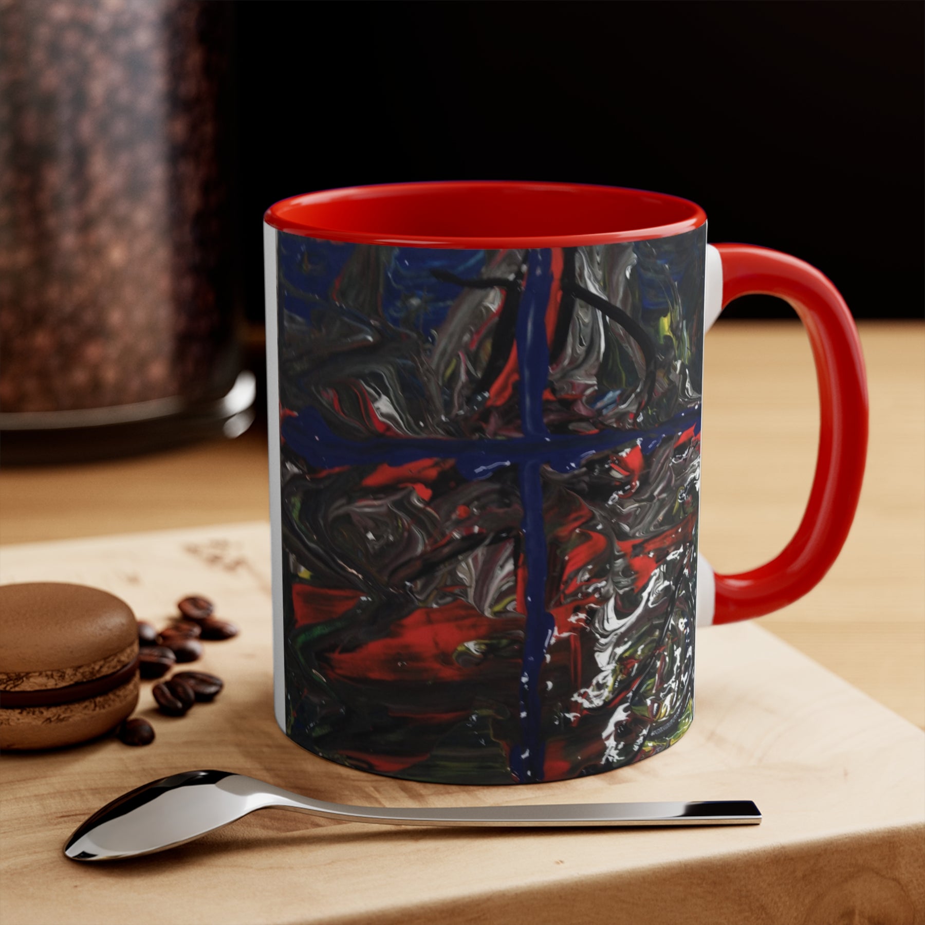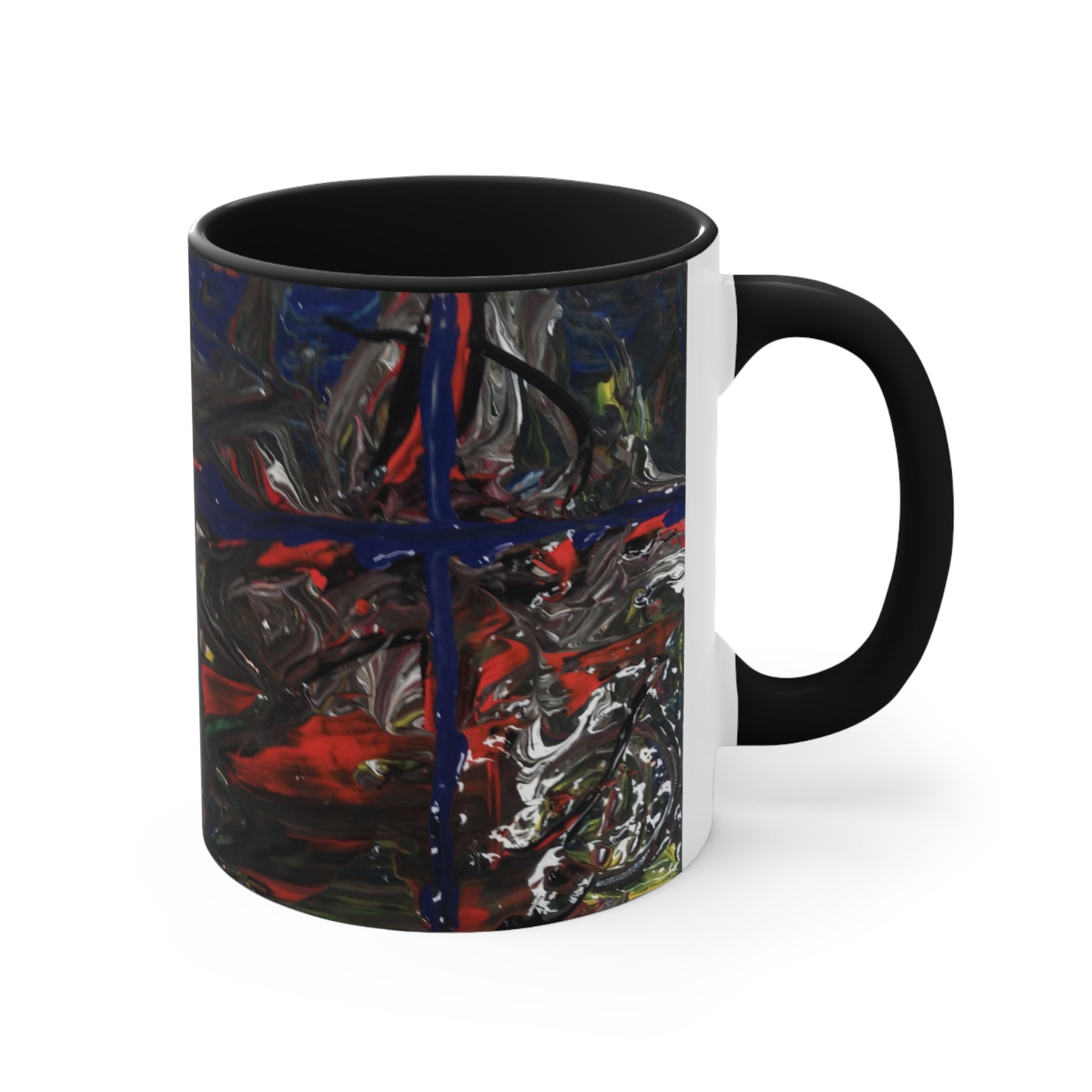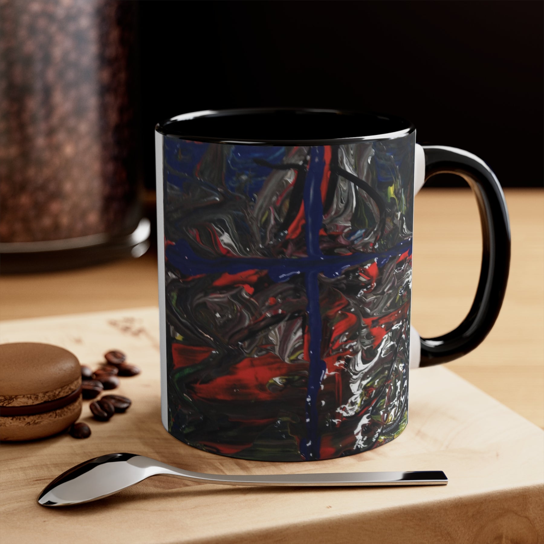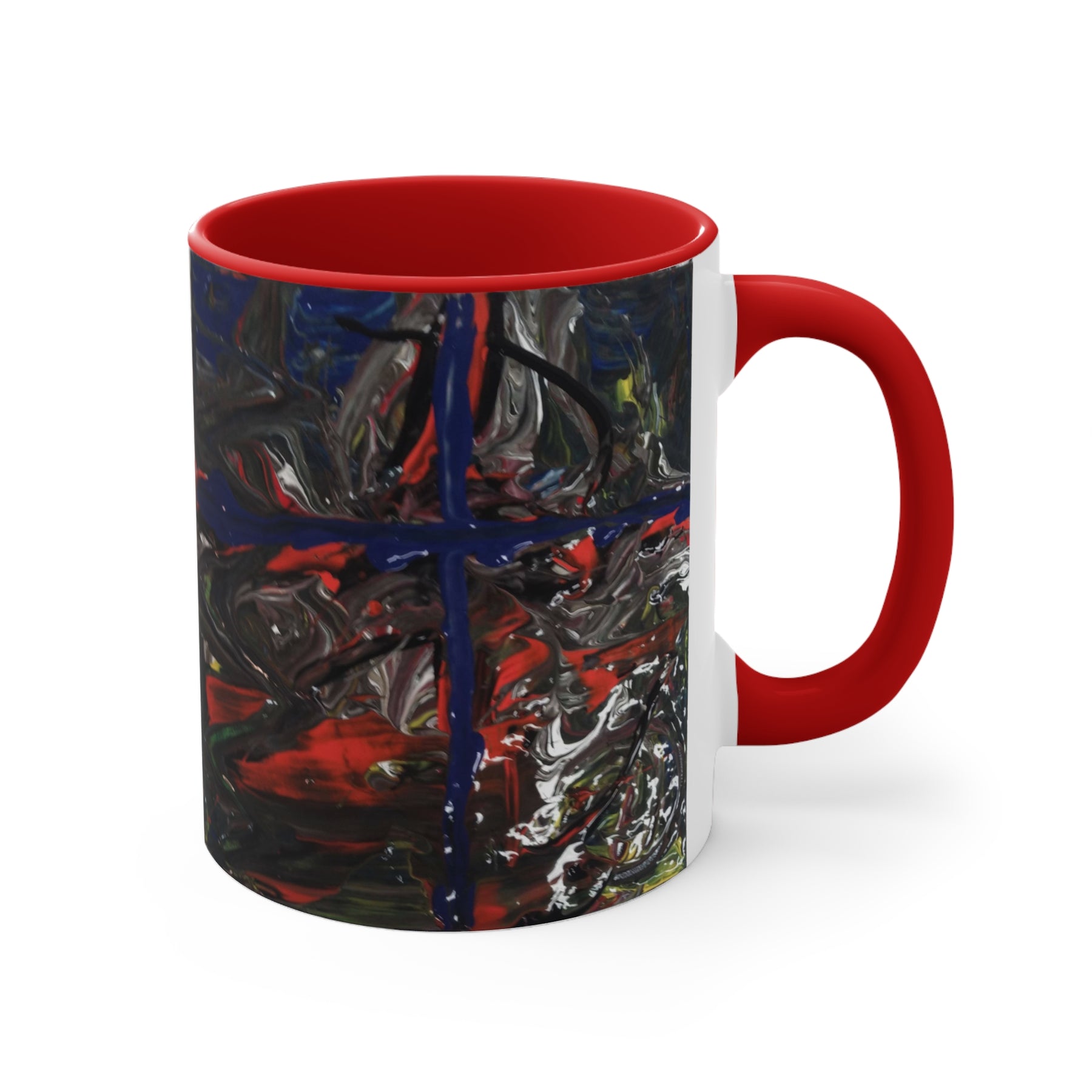This ceramic accent mug brings artful texture and bold color into everyday moments. The glossy ORCA-coated print wraps around the exterior, showing a painterly, abstract design streaked with deep blacks, reds, and hints of color — like a studio canvas condensed into a comforting cup. The interior and handle come in a soft pink that frames the artwork and adds a warm contrast. It feels tactile in the hand, built for morning routines, late-night sketches, and quiet coffee breaks that deserve a little beauty.