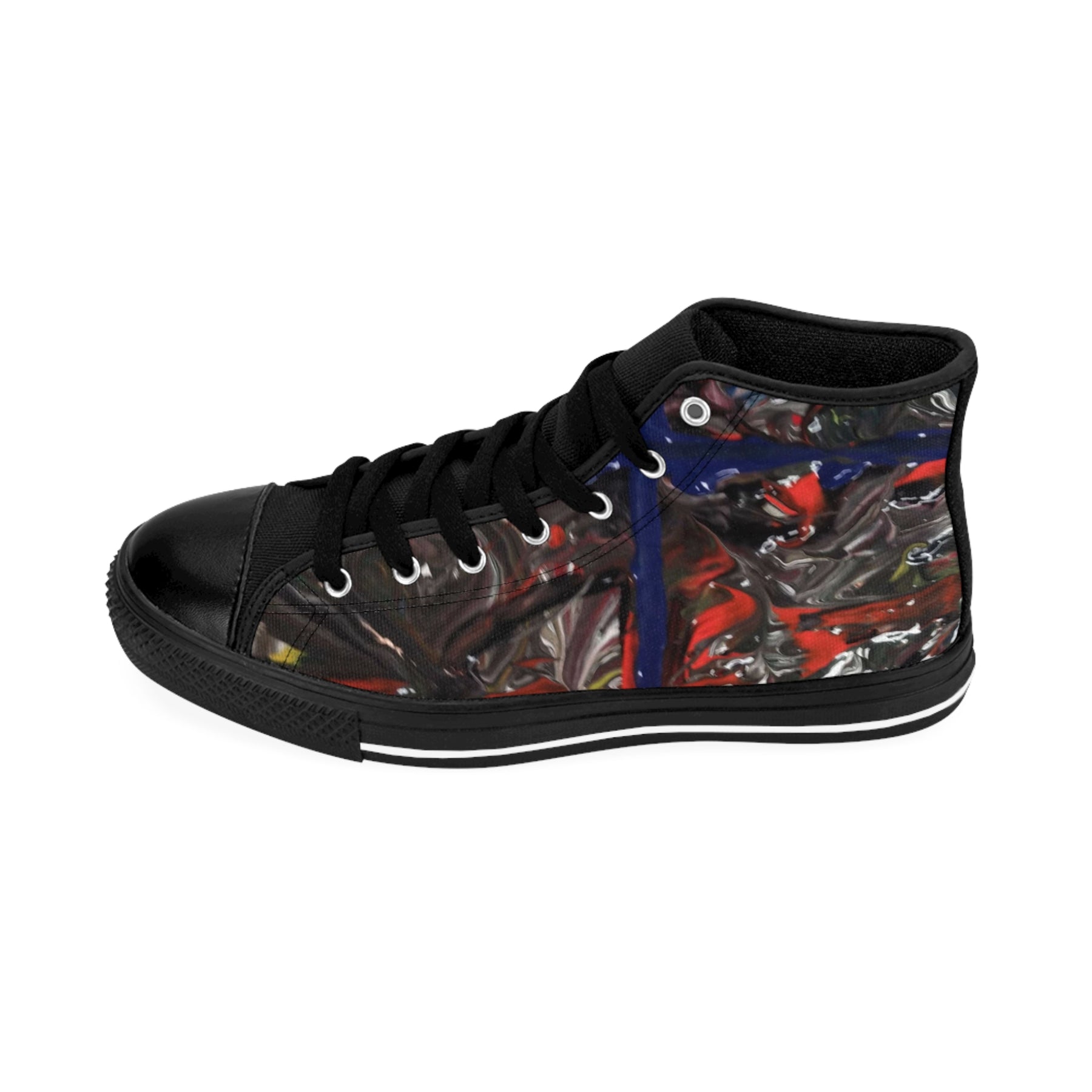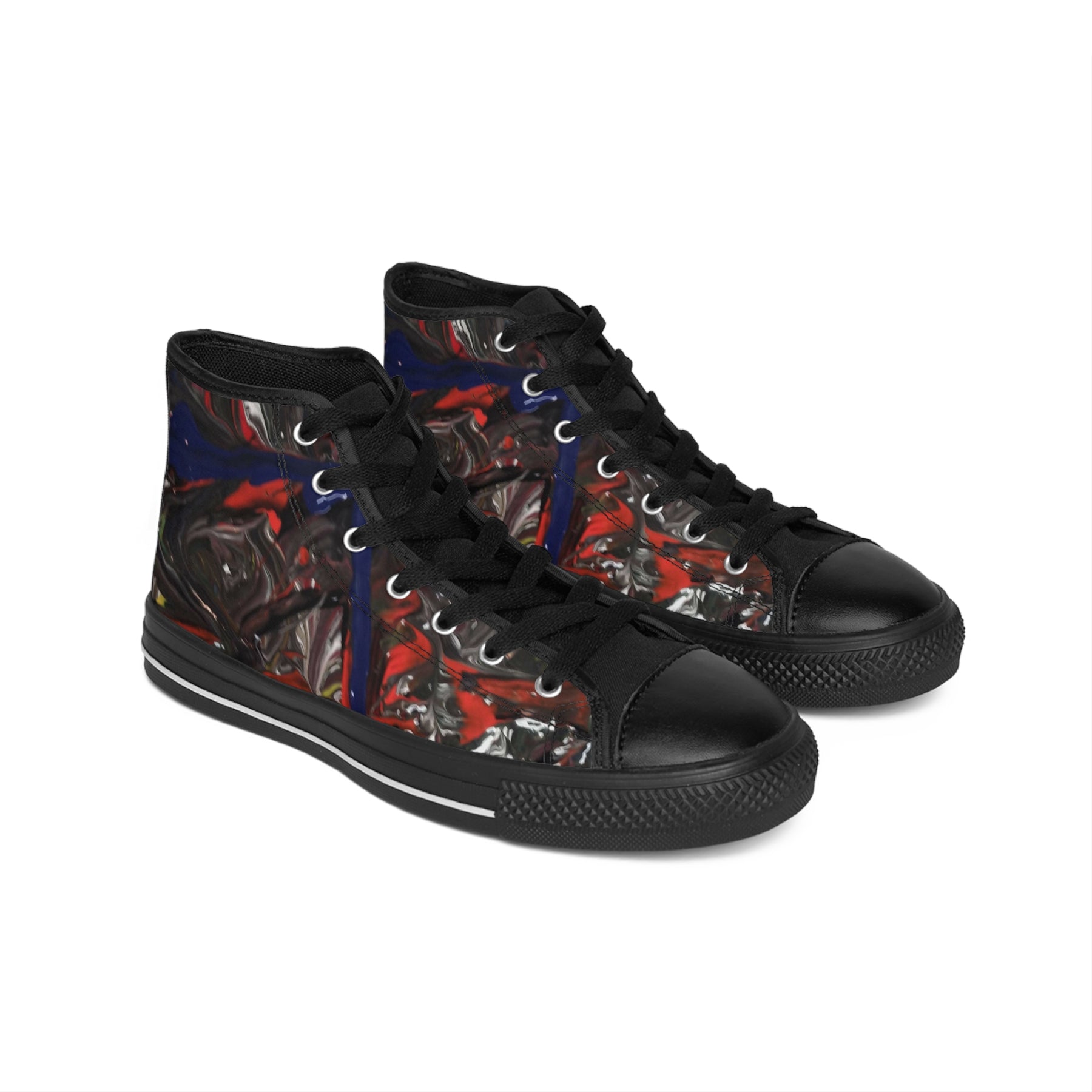 These high-top sneakers bring streetwise energy to every step. The canvas panels wear a bold, painterly pattern of deep reds, blues and charcoal swirls that read like an urban mural—alive and slightly rebellious. A reinforced pleather toe and durable rubber sole stand up to everyday scuffs, while the soft foam insole and foamed lining keep the fit breathable and comfortable for long days on the move. Metal eyelets and black stitching give a sharp, finished look that pairs with denim, layered streetwear, or a pared-back outfit when you want the shoes to do the talking. They sit at a 5" calf height for that classic silhouette and arrive ready to patrol city sidewalks or anchor a casual weekend outfit.