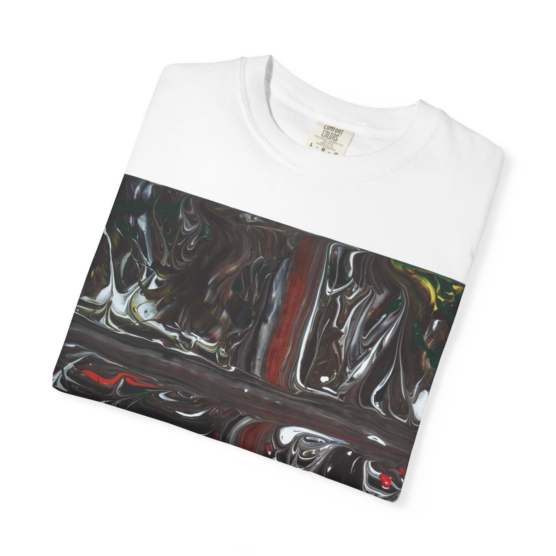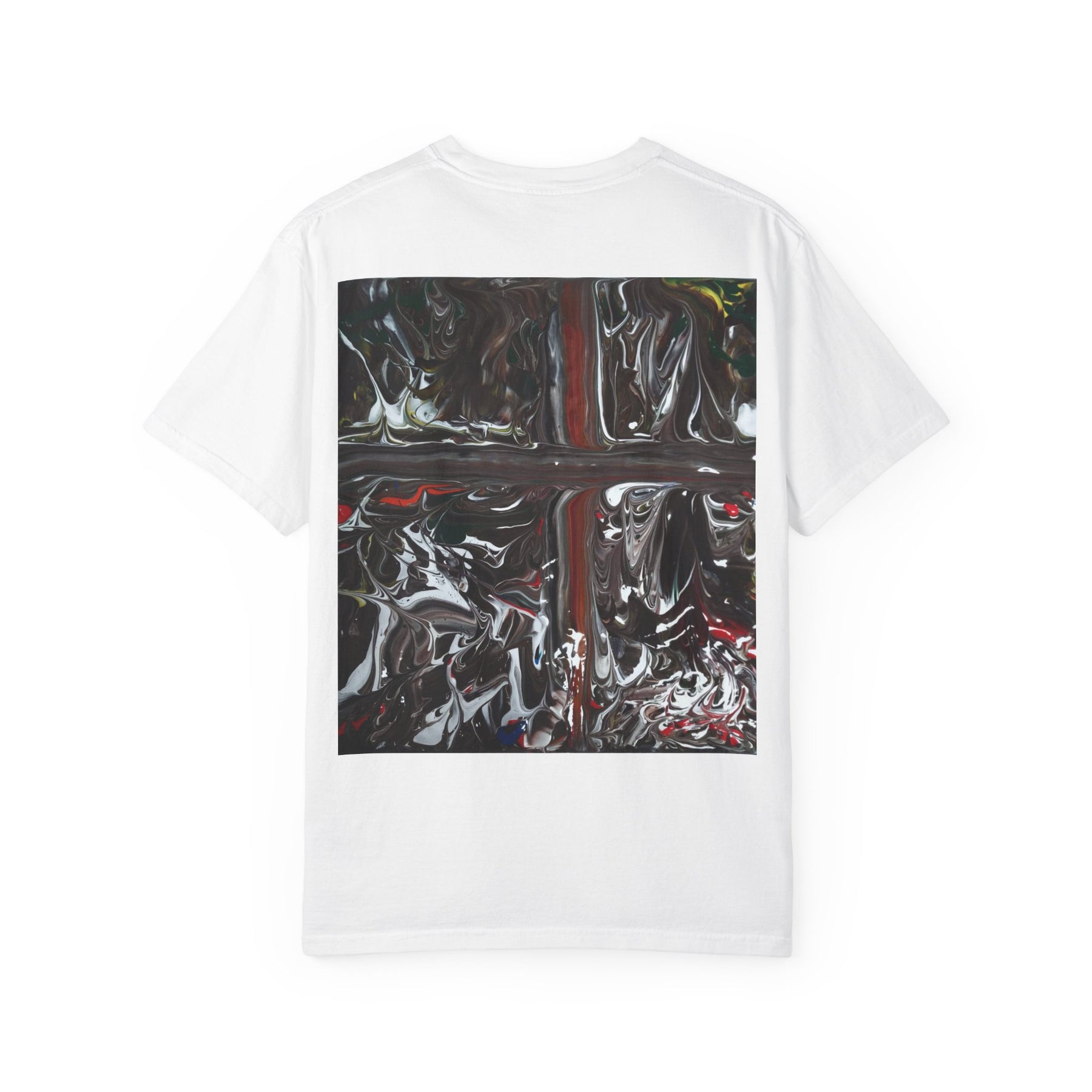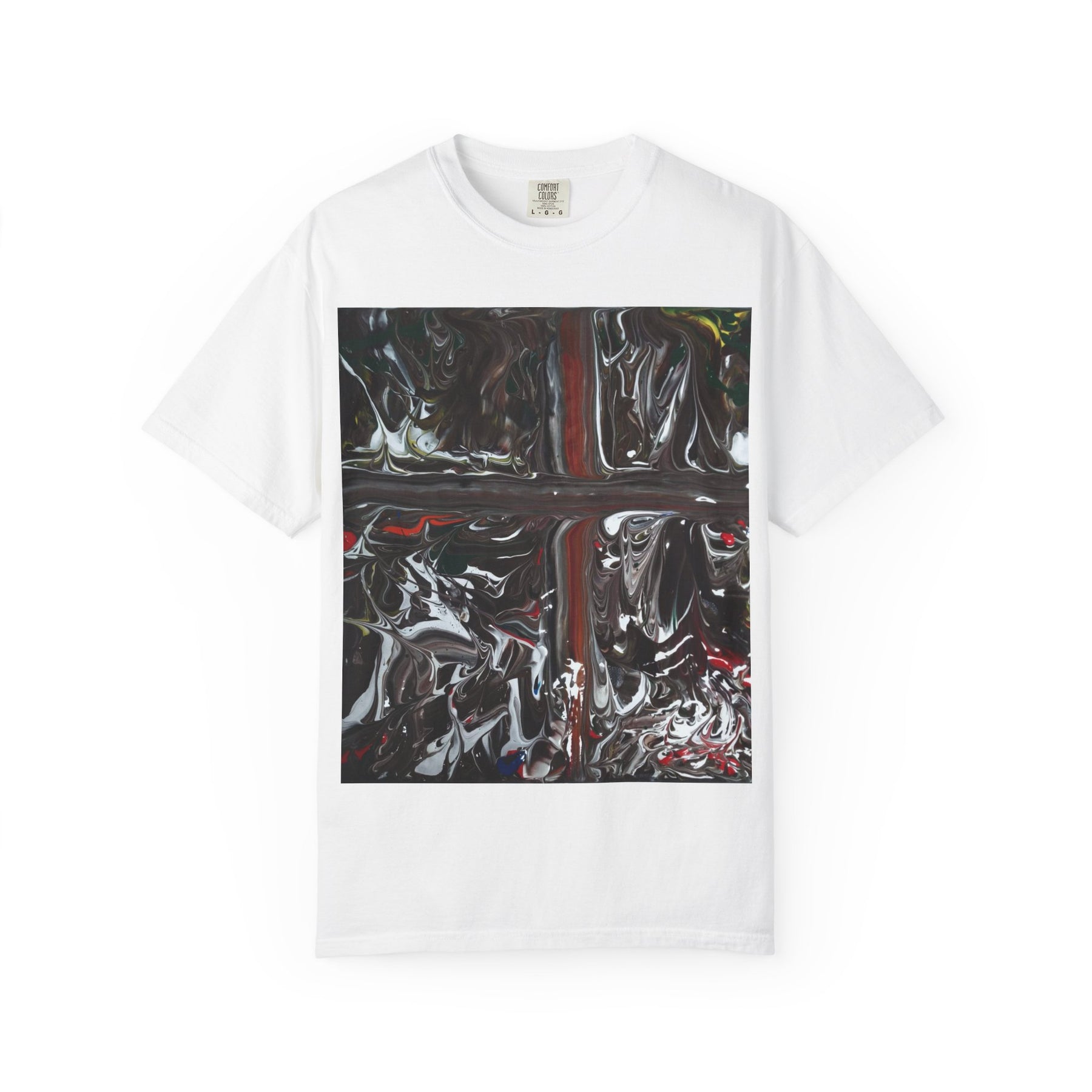 A garment-dyed cotton tee with a bold, abstract square print that feels like painted glass — glossy swirls of black, deep crimson, and hints of muted color collide into a reflective, moody panel. The soft, broken-in fabric drapes with a relaxed fit and a lived-in texture that lets the artwork sit naturally against the body. Wear it layered under a denim jacket or loose over jeans; the print reads like a private artwork you carry with you, suited to quiet nights, gallery visits, or wandering city streets at dusk. The heavier-but-soft weight gives structure while staying comfortable for everyday wear.