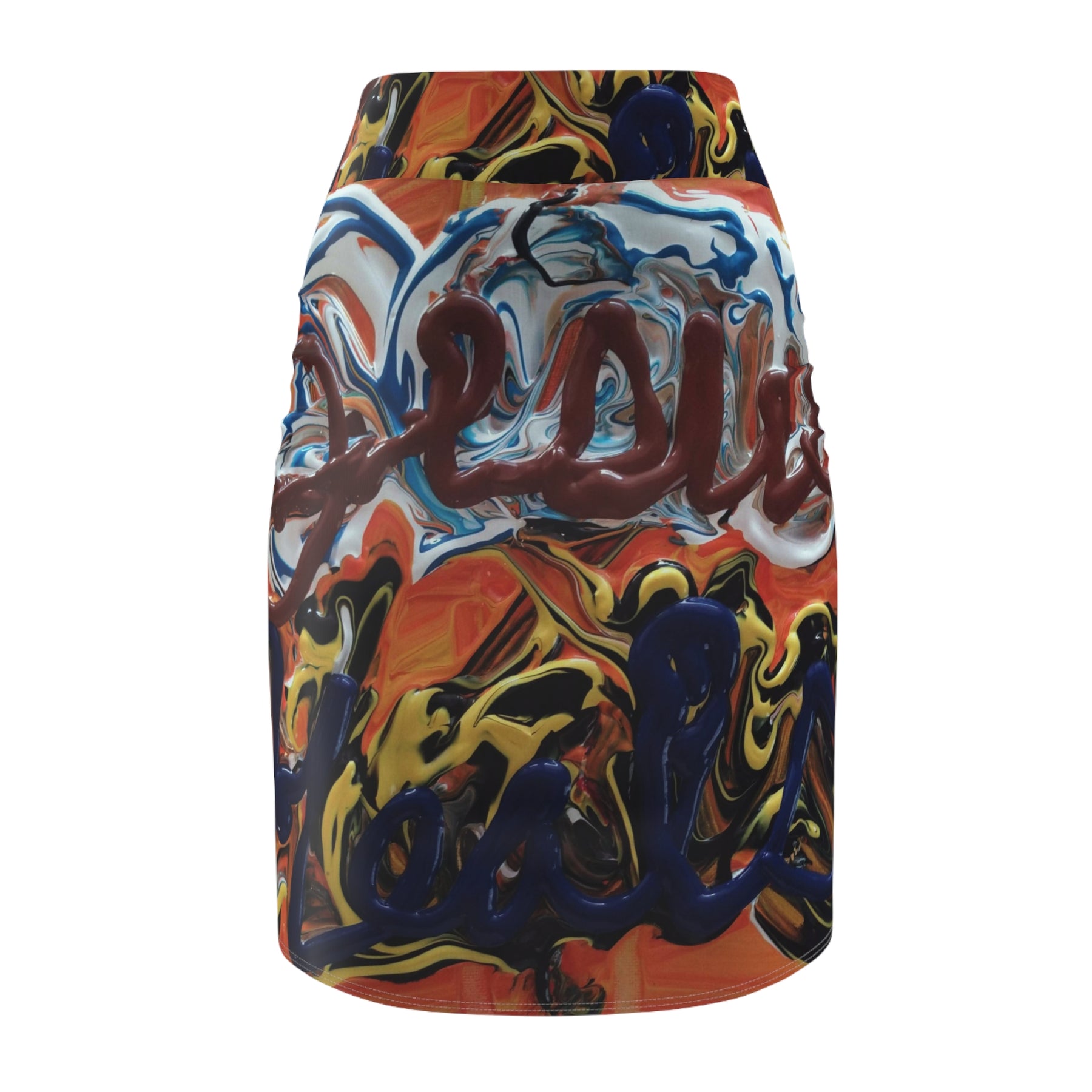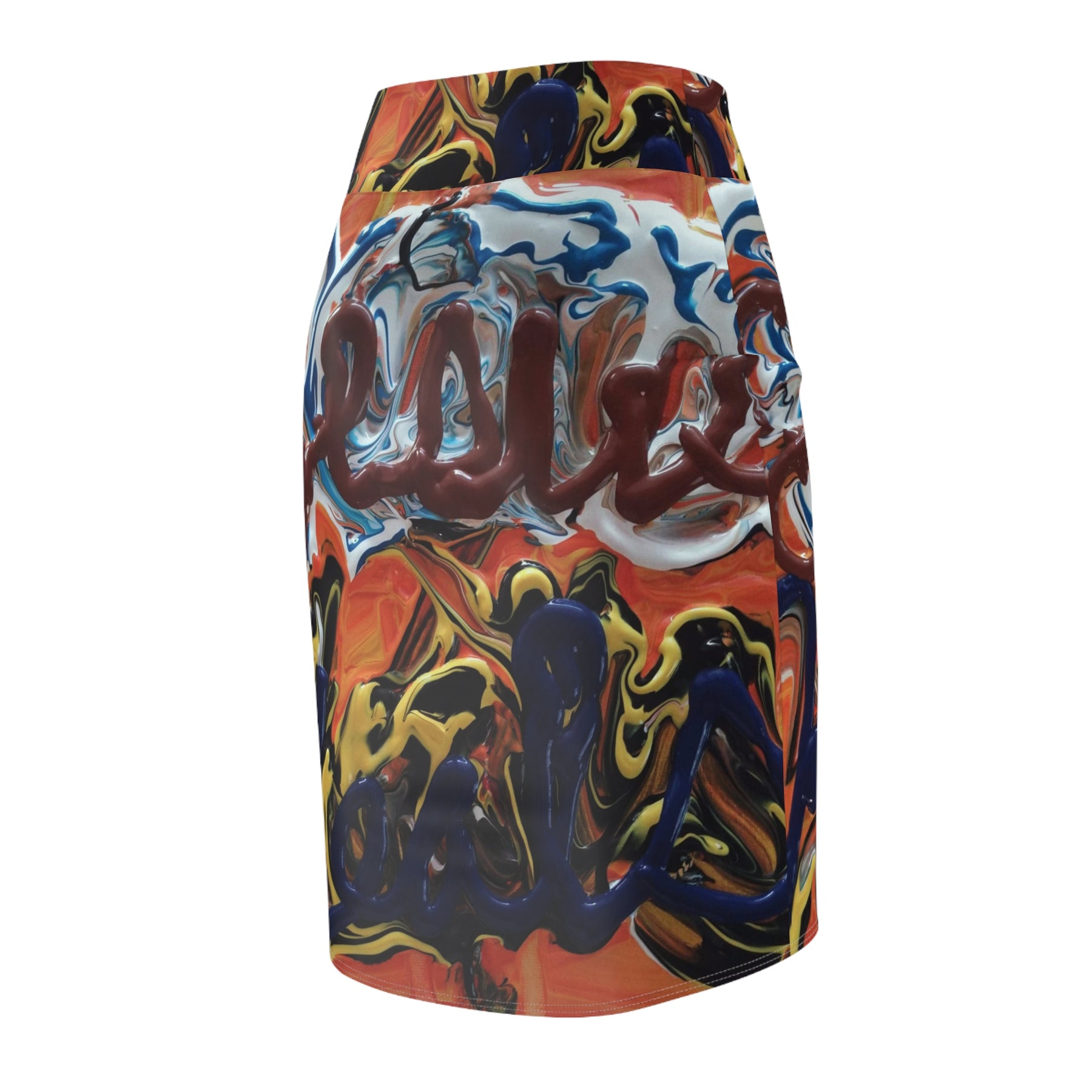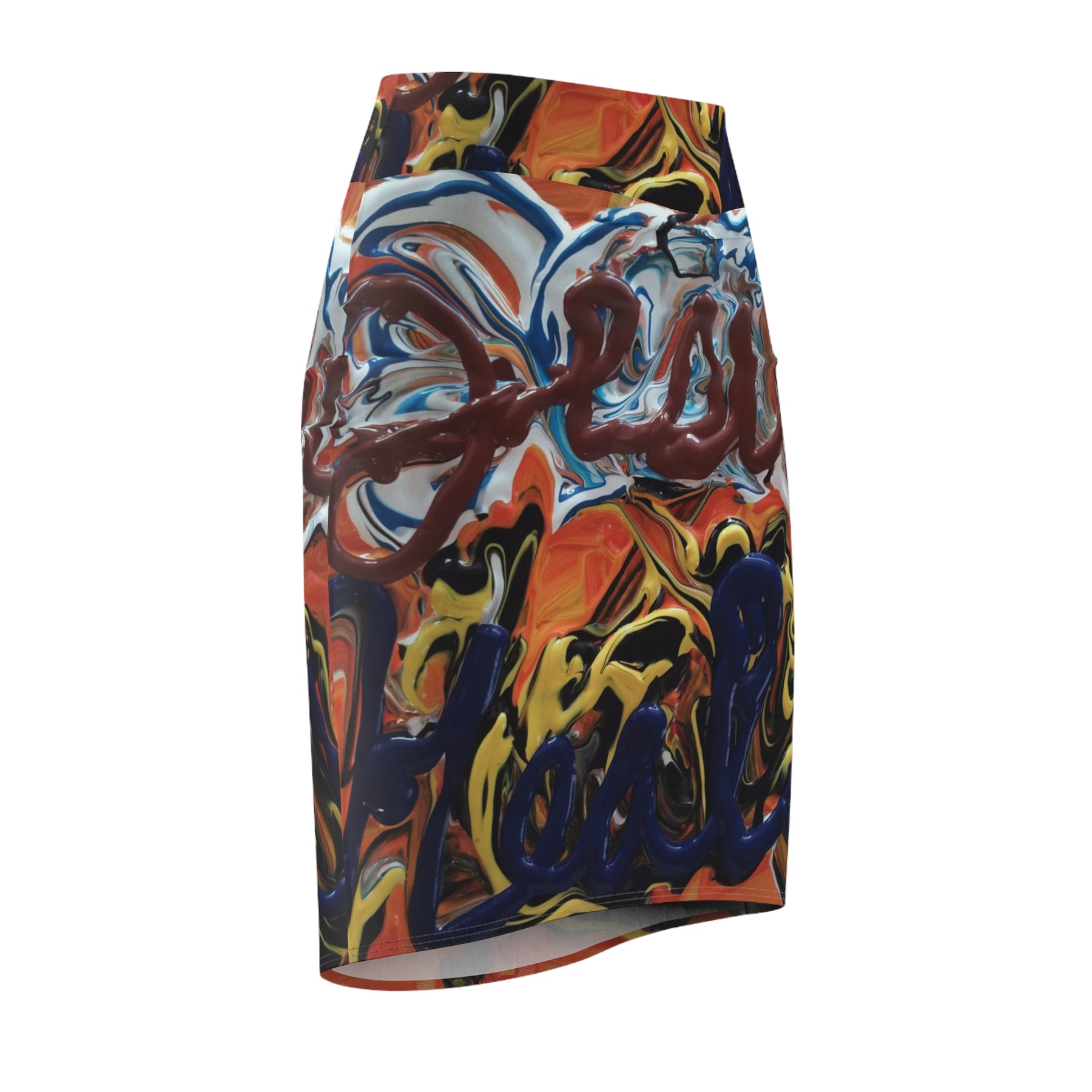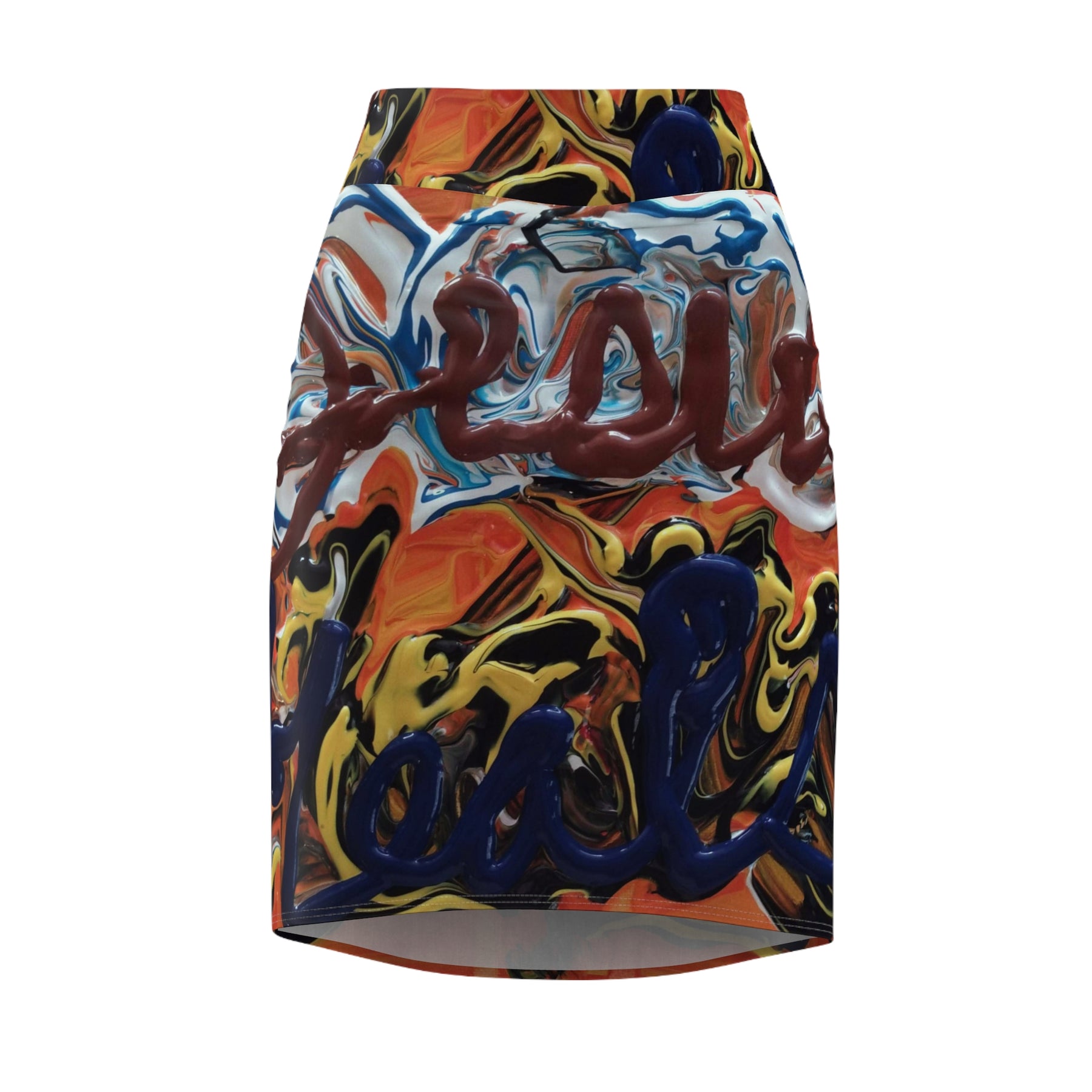 This mid-waist pencil skirt brings bold, painterly energy to everyday wear. The all-over, roll-to-roll print wraps an abstract swirl of fiery oranges, inky blues, and creamy highlights around a streamlined silhouette that sits comfortably at the mid waist. The fabric’s 4-way stretch and soft polyester-spandex blend move with you—no tugging, just smooth lines—and the flatlock stitching keeps seams low-profile against the skin. Wear it with an oversized knit for relaxed city afternoons or tuck in a crisp blouse for a gallery opening. The skirt’s assembled-in-the-USA construction and printed care label add thoughtful, wearable details.
