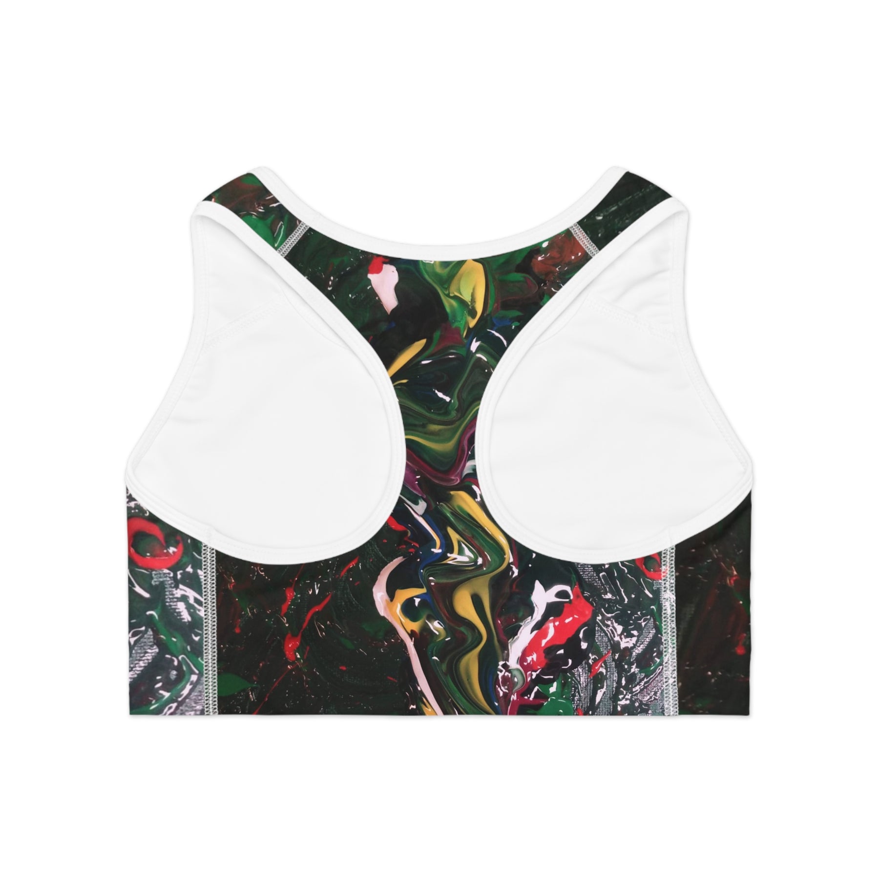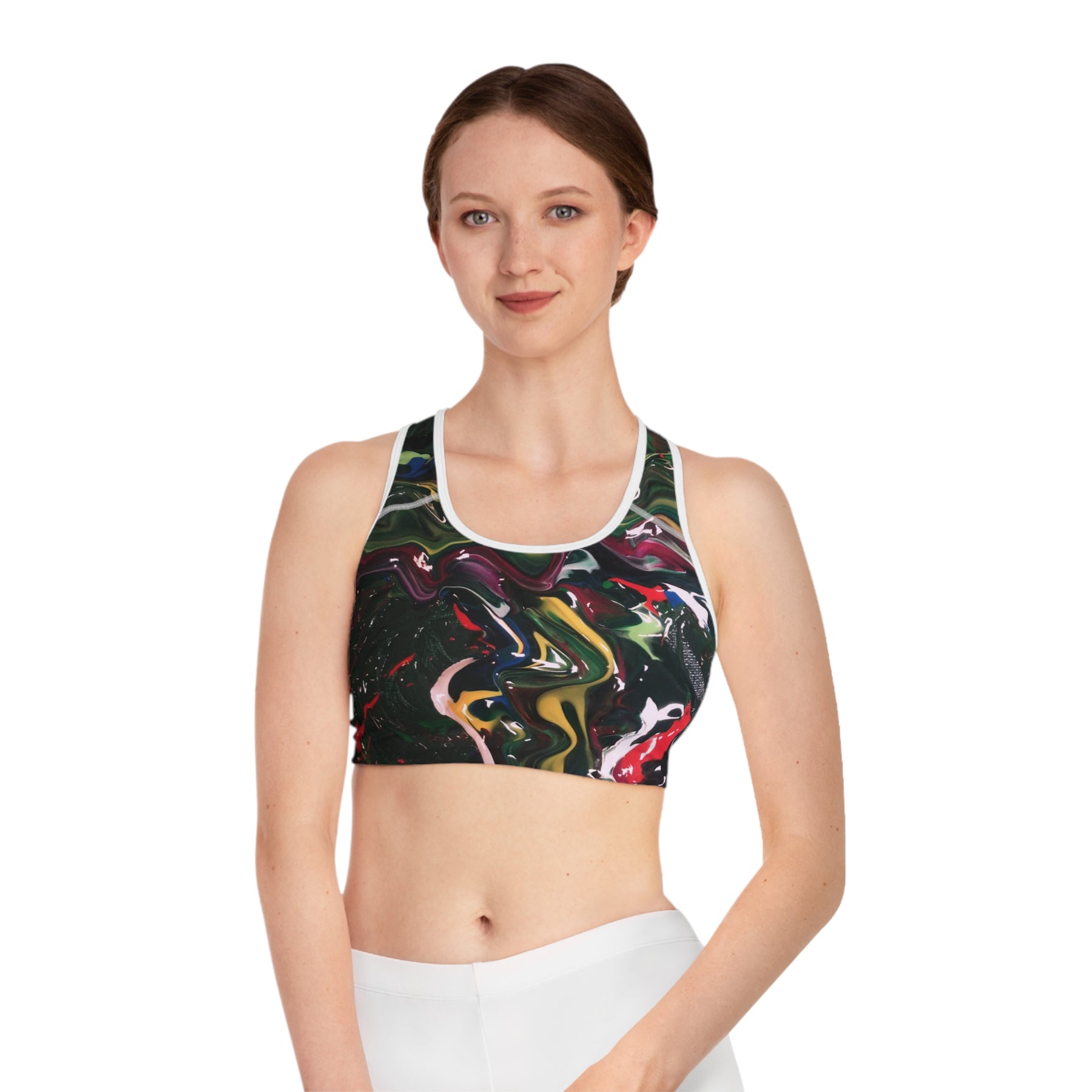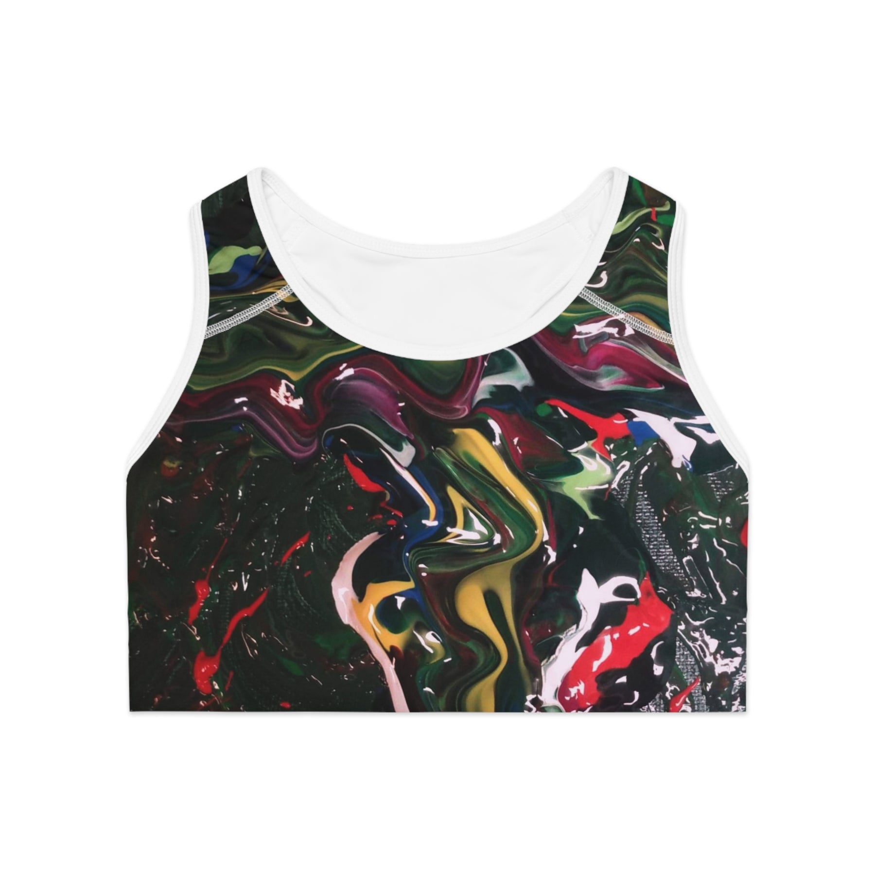 Bold, painterly swirls of color meet performance design in this all-over print sports bra. The print reads like a pocket of abstract art—deep greens and blacks threaded with flashes of red, yellow and white—so your movement becomes part of the canvas. Built from a moisture-wicking polyester-spandex blend with a compression fit and double-layer front, it stays put and supports without feeling bulky. A wide elastic band and reinforced shoulder straps give steady support for studio sessions, runs, or active days when you want comfort and expression in equal measure. Tear-away label and midweight fabric keep the feel clean and wearable. Wear it under a loose tank for layered gym looks, pair it with high-waist leggings for a paint-night vibe, or let the print peek out for everyday energy.