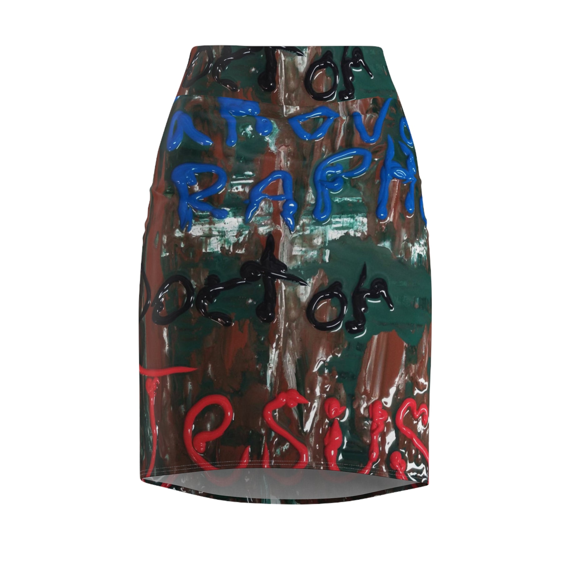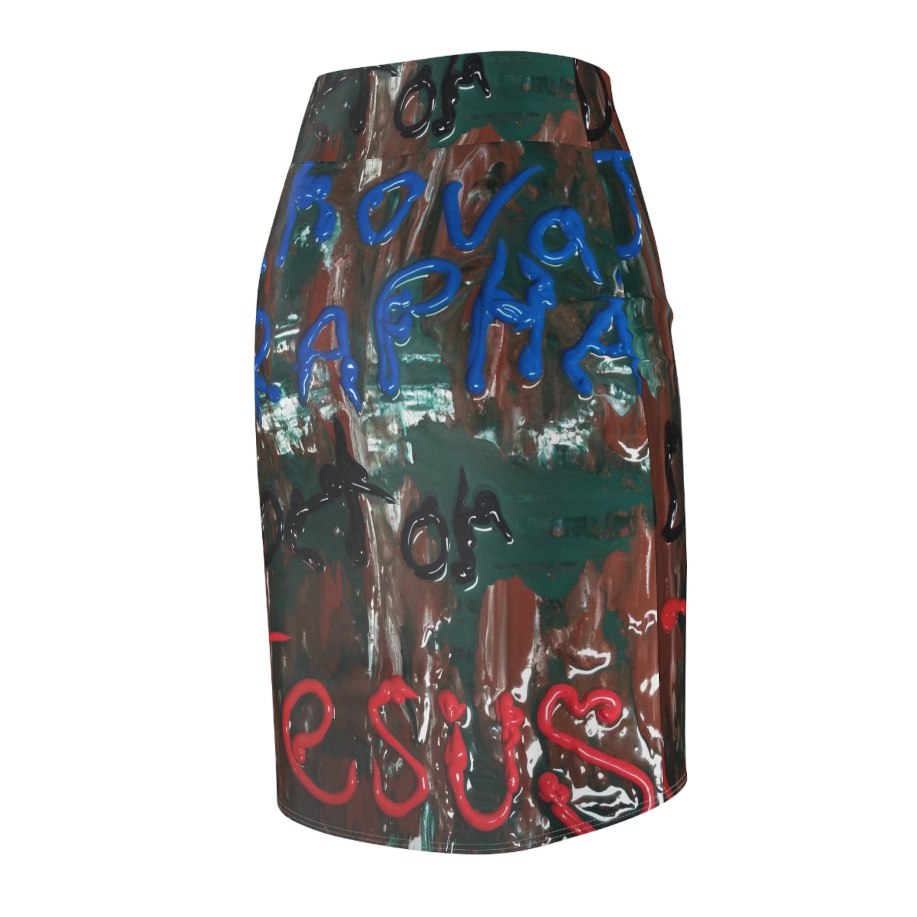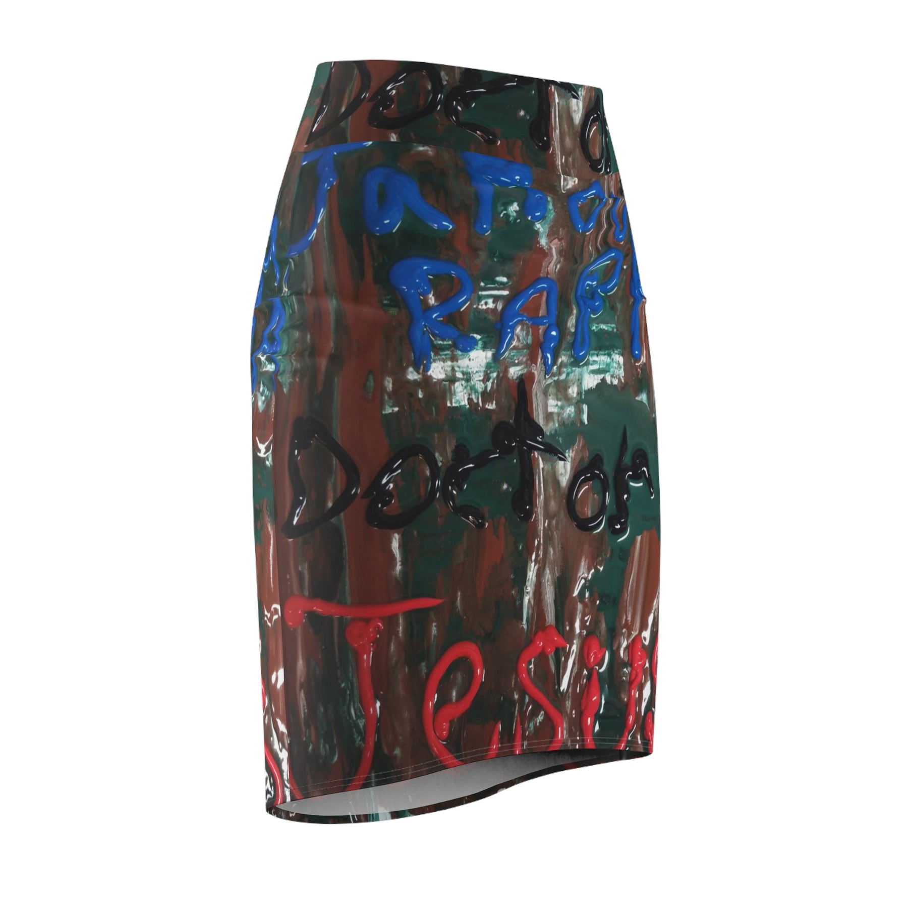 This printed pencil skirt carries an urban, painterly energy — bold strokes of blue, green and red layered over a distressed, textured background. It sits at a mid waist and moves with a four-way stretch that keeps the silhouette sleek without feeling constrictive. The all-over print wraps the garment so the design reads continuously around the body, creating a wearable piece of street-style artwork. Lightweight yet durable, the fabric has enough recovery to hold its shape while accommodating everyday motion. Wear it with a tucked tee and boots for market days, or pair with a blazer when you want the art to lead the conversation at a gallery opening.