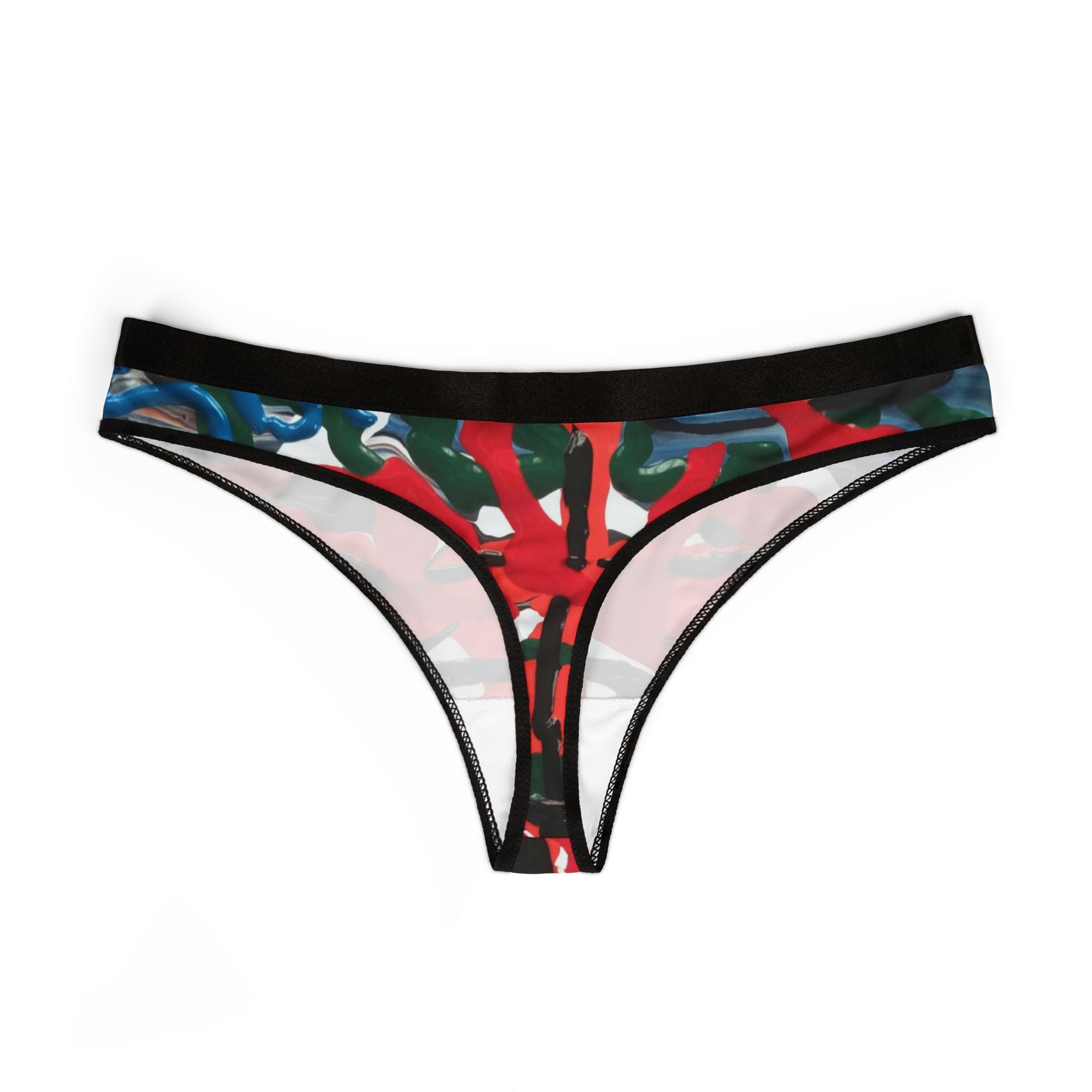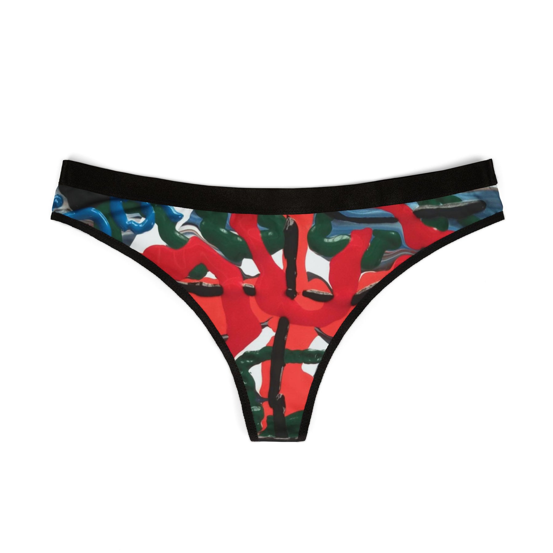 These cheeky, low-rise thongs bring bold color and comfortable stretch to everyday wear. Lightweight polyester with a touch of spandex hugs curves and moves with you, while the breathable antimicrobial fabric keeps things fresh. The vivid, painterly print wraps across the front and back, framed by a sleek black elastic waistband and contrasting stitch detail. Wear them under fitted dresses or jeans, or keep them as a bright, private treat — they sit flat under clothing and feel almost weightless against the skin.