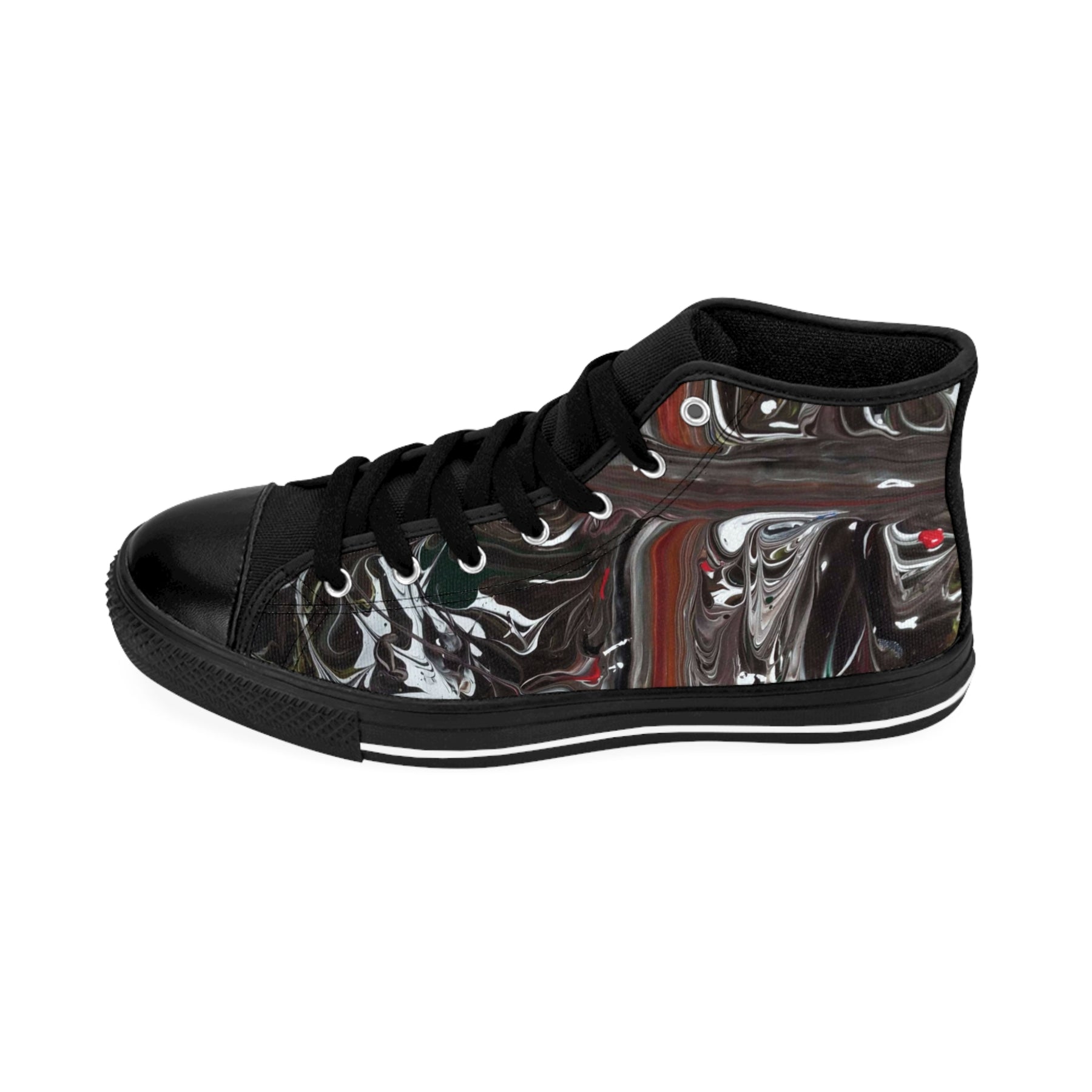 These high-top sneakers bring an artful, moody edge to everyday wear. The swirling abstract print in deep blacks, charcoal, rust and hints of silver feels like a late-night street mural wrapped around a classic silhouette. Built on a 5" calf-high profile with reinforced pleather toe and durable rubber outsole, they stand up to city streets and spontaneous adventures. The breathable foamed insole and fine-weave nylon canvas lining keep feet comfortable through long days and nights. Silver metal eyelets and black stitching give a finished, slightly industrial look that pairs effortlessly with slim jeans, layered outerwear, or an oversized coat when you want your outfit to feel intentional and a little mysterious.