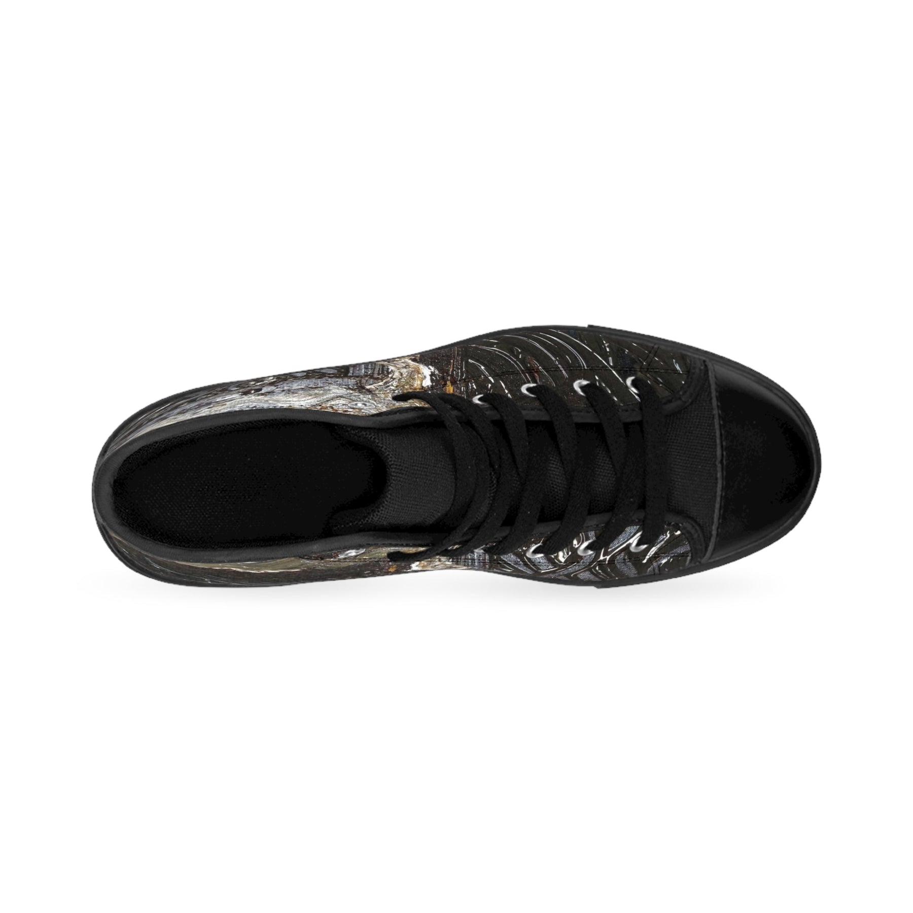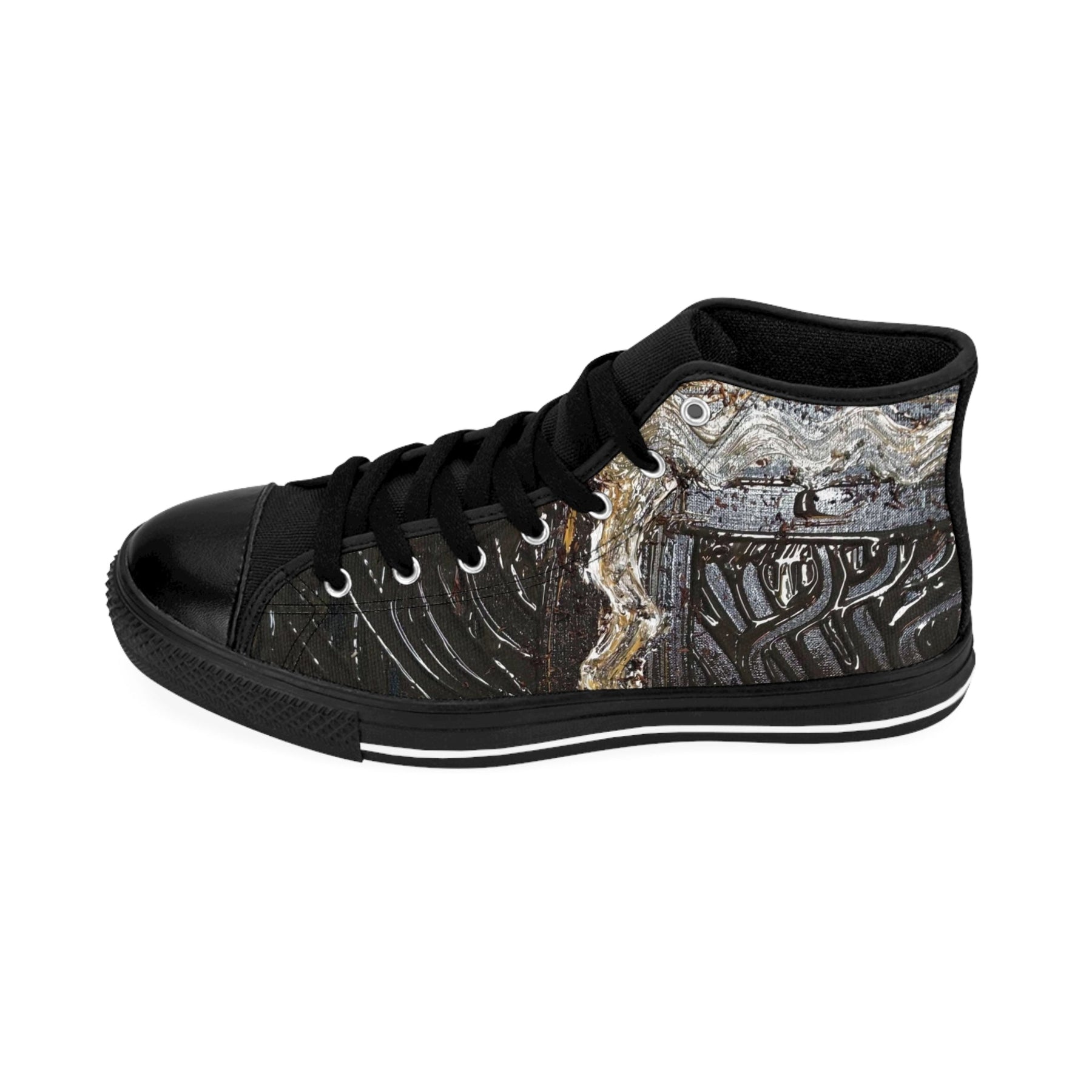 These high-top canvas sneakers bring a bold, artful edge to every step. The textured nylon canvas carries a dark, weathered pattern with streaks of rust-like detail that reads equal parts urban grit and wearable art. Soft foam lining and a breathable insole cushion your foot while the reinforced pleather toe and durable rubber outsole stand up to daily wear. Black stitching, eyelets, and laces keep the look streamlined so the artwork takes center stage. Wear them with cropped jeans or layered skirts for city days, late-night shows, or weekend wanderings — they settle into a wardrobe that leans toward rugged, creative, and slightly unconventional style.